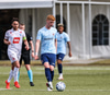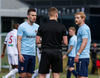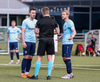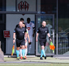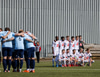 Leikmenn eru að labba saman aftur inn á völlinn. En fyrir leikinn þurftu liðin að koma sitthvort inná vellinn. En leikurinn er rétt í að fara byrja aftur!