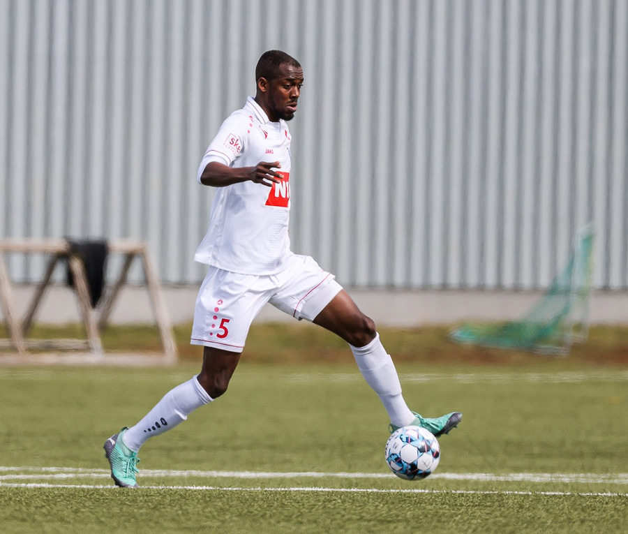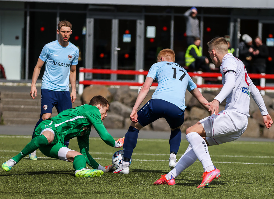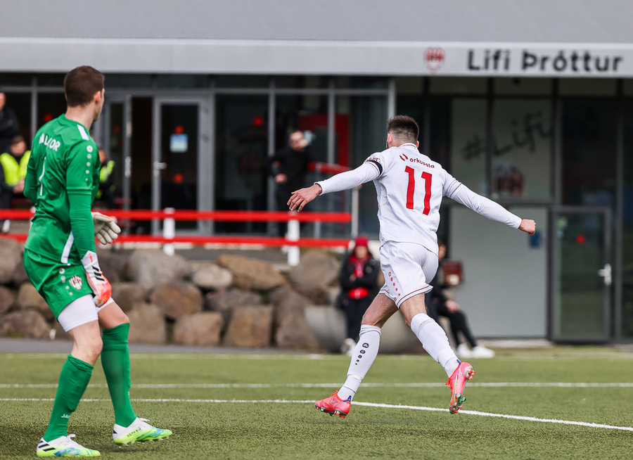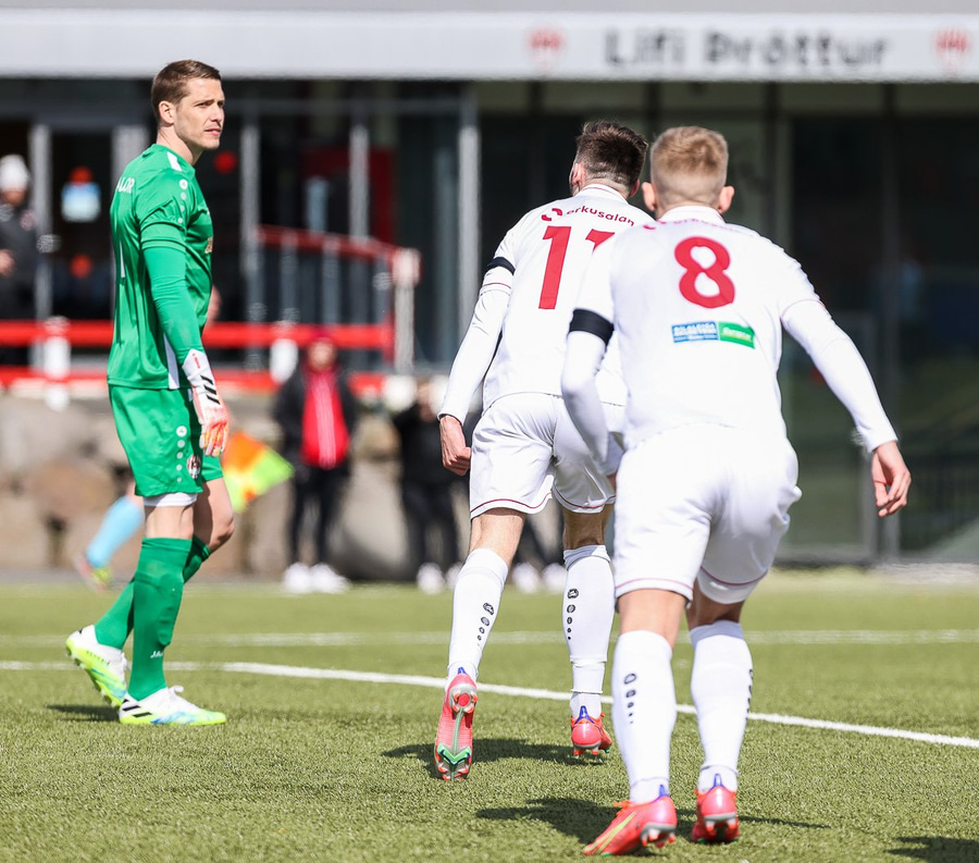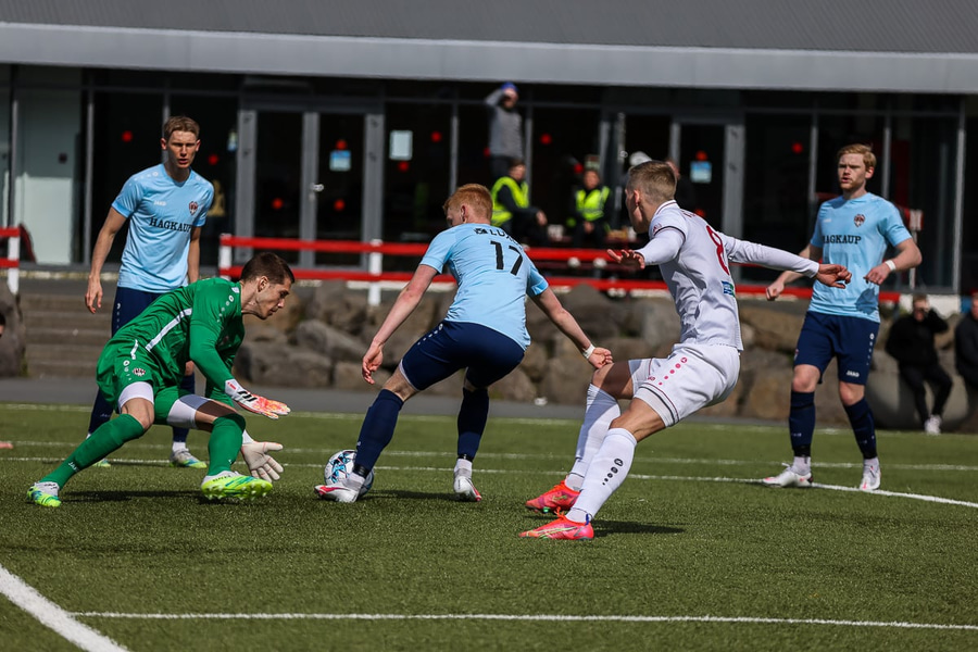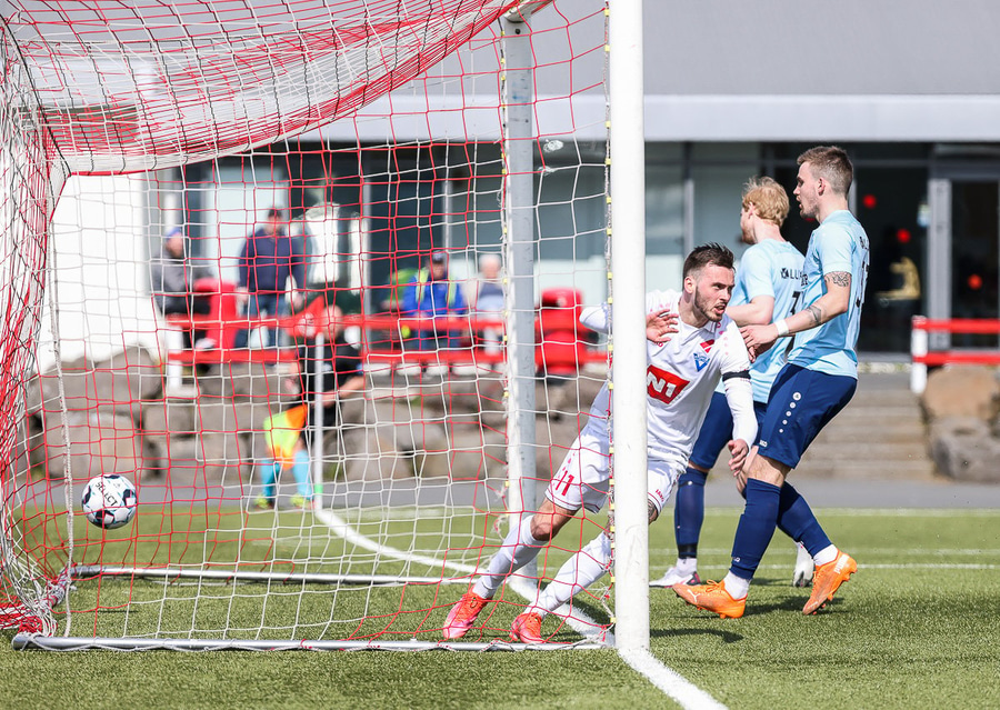 Skot frá Hlyn Sævar Jónsson, hægra megin við tegin, fer í löppina á Isakia, sem stóð inn í mið teig. Isakia nær svo að fá boltann inn í mark