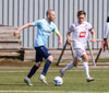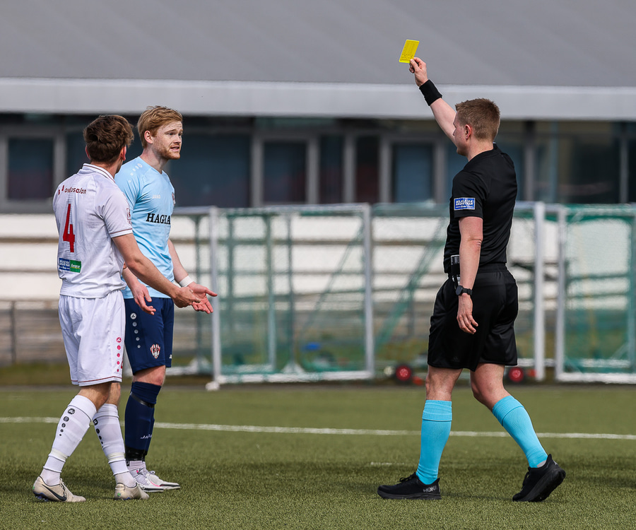 Beint rautt spjald. Alveg rétt ákvörðun. Hreinn Ingi tæklar Bjart Bjarma sem snýr bakinu við honum og ætlar í skyndisókn.