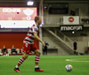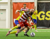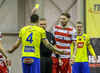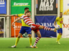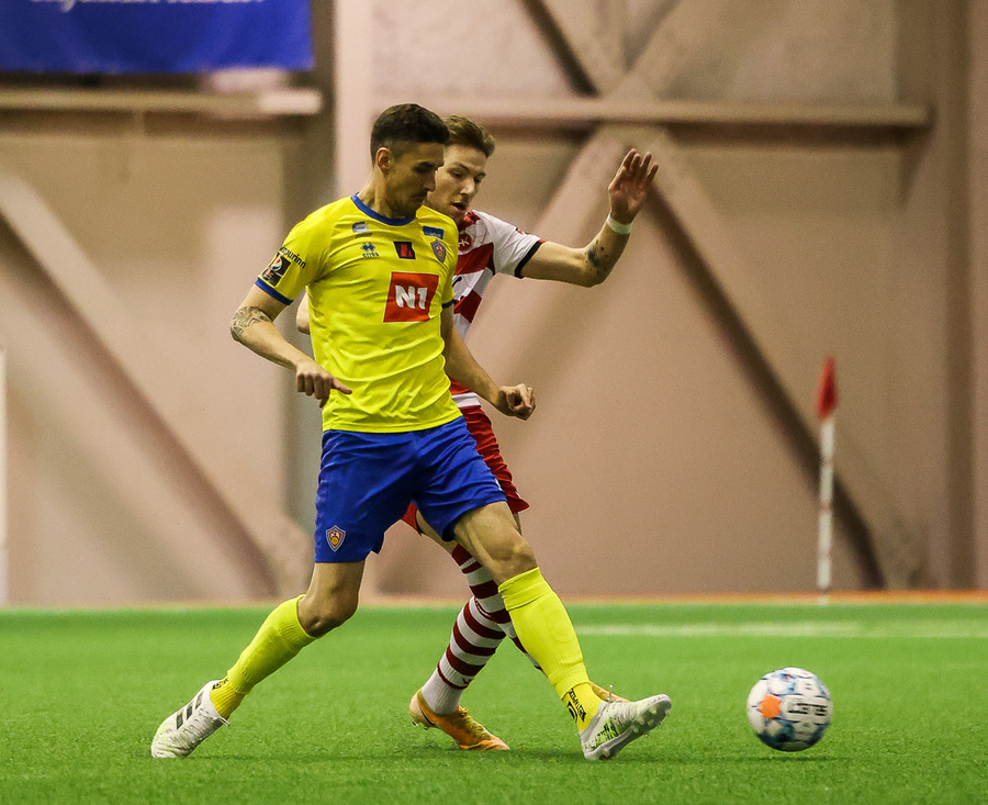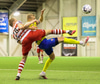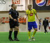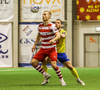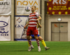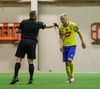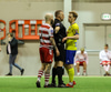 Dusan er alltof seinn inn í Stefán og fær réttilega gult spjald.