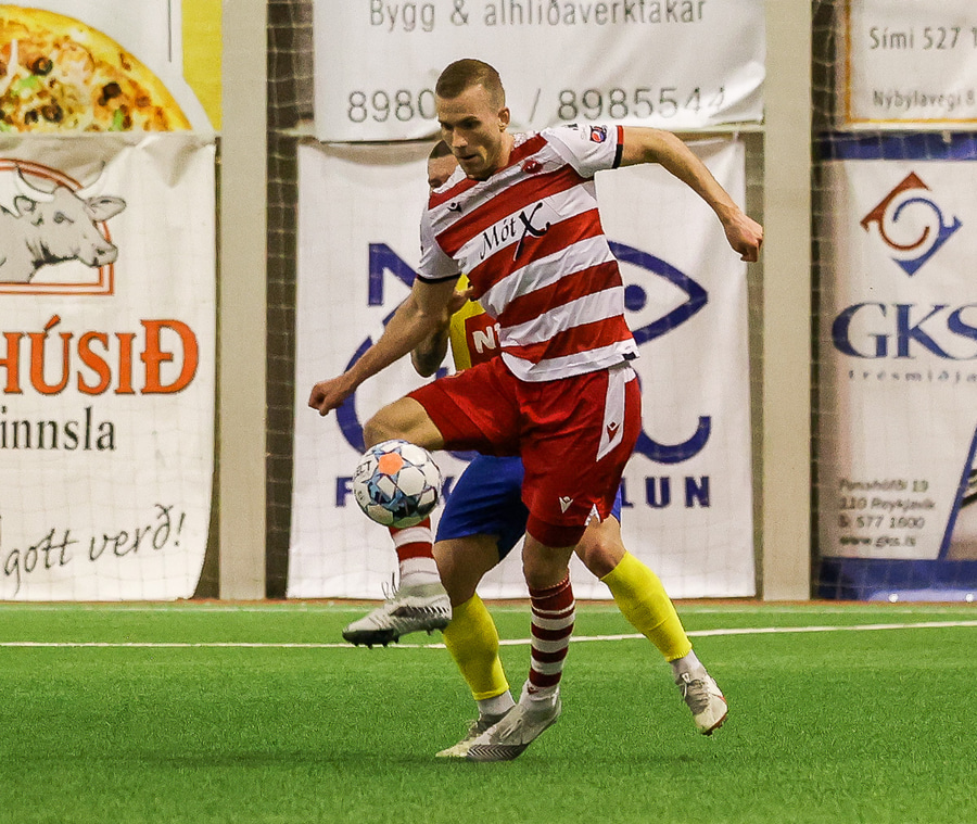 Nökkvi fer í skotið hérna á vítateigshorninu vinstra megin en það er vel yfir markið.