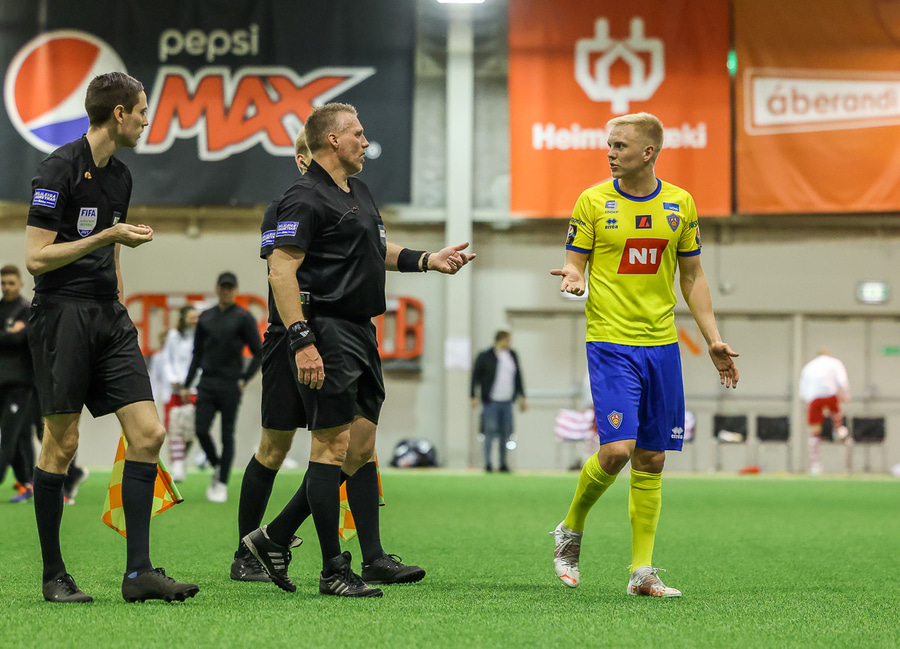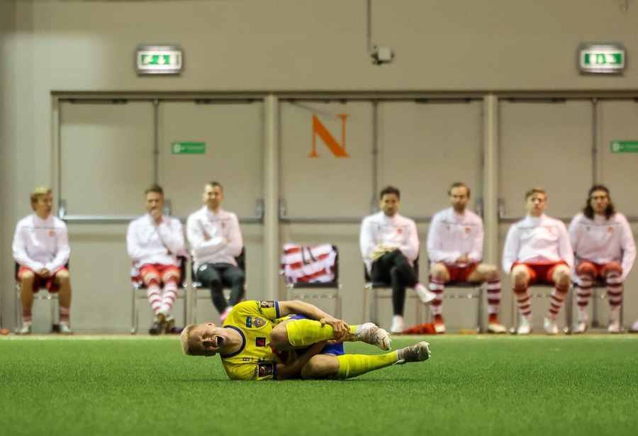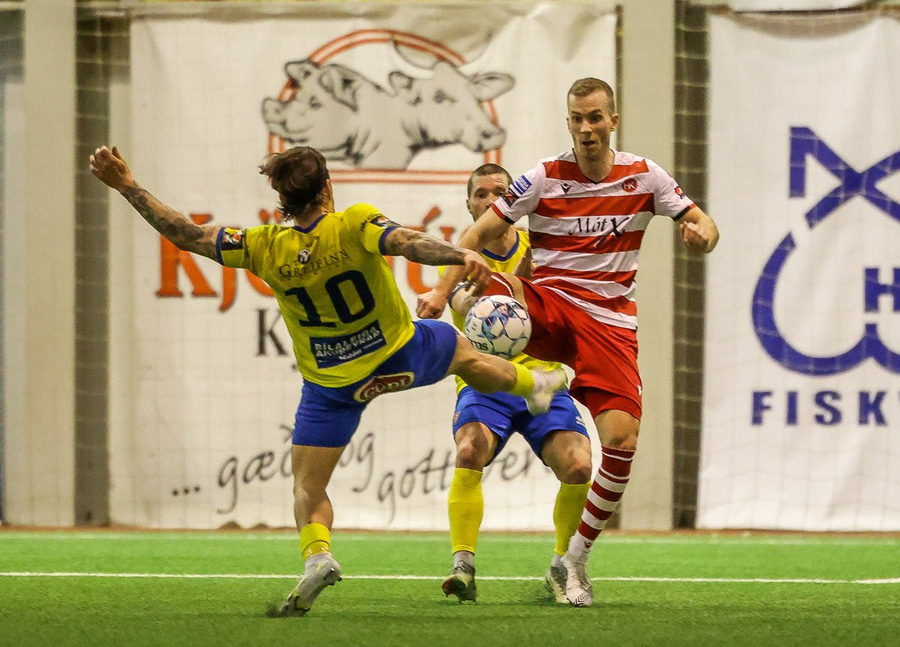 Fer í hörku tæklingu á Nökkva og nær boltanum en Pétur metur sem svo að tæklingin hafi verið full groddaraleg.