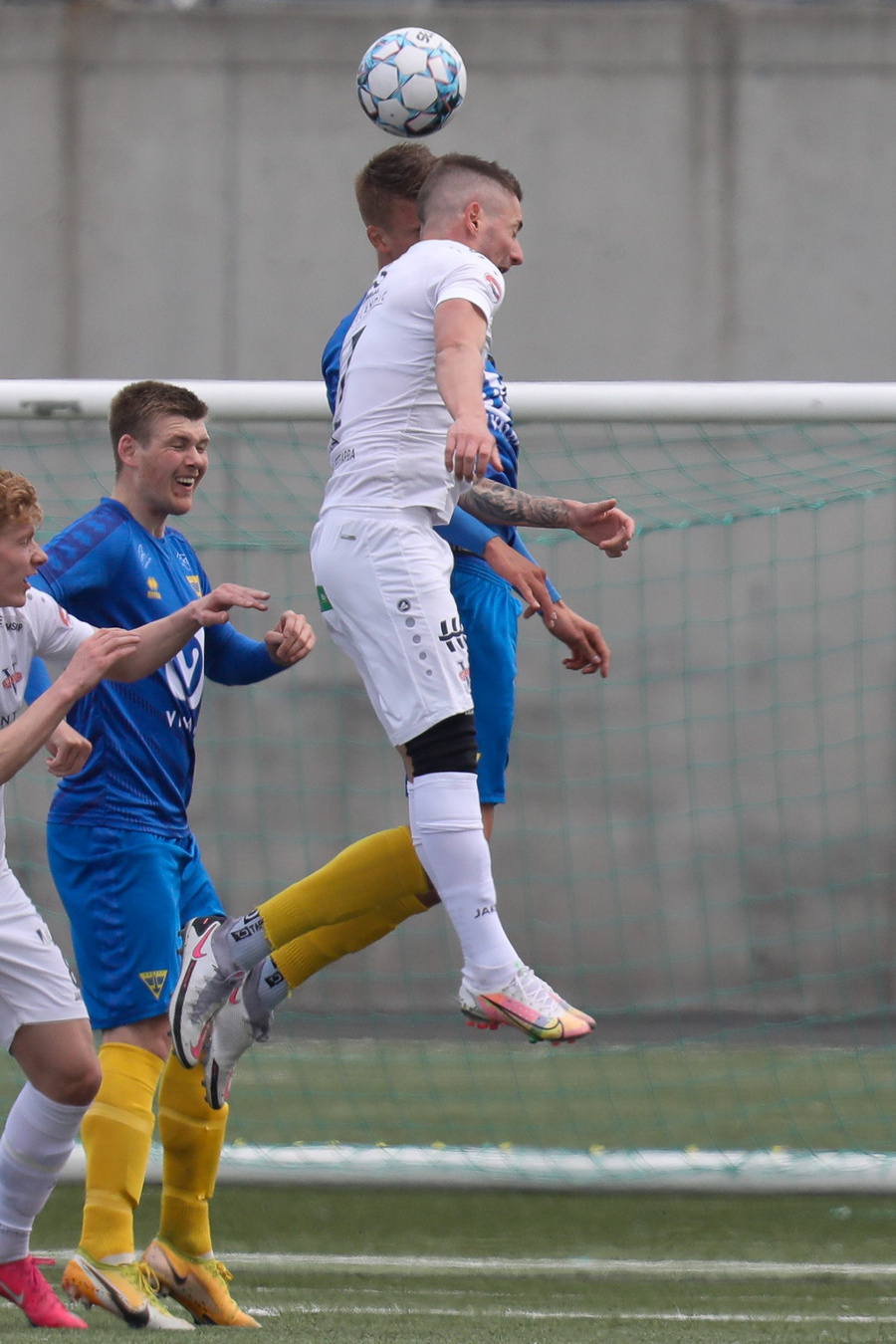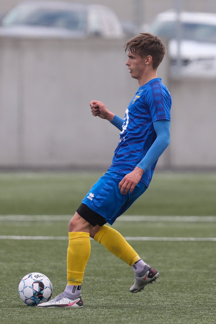 Diogo Coelho reynir krossinn en boltinn beint í hendurnar á Hákoni. Lítið að gera hjá honum í dag.