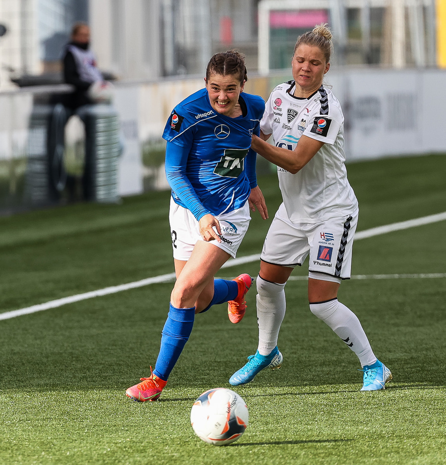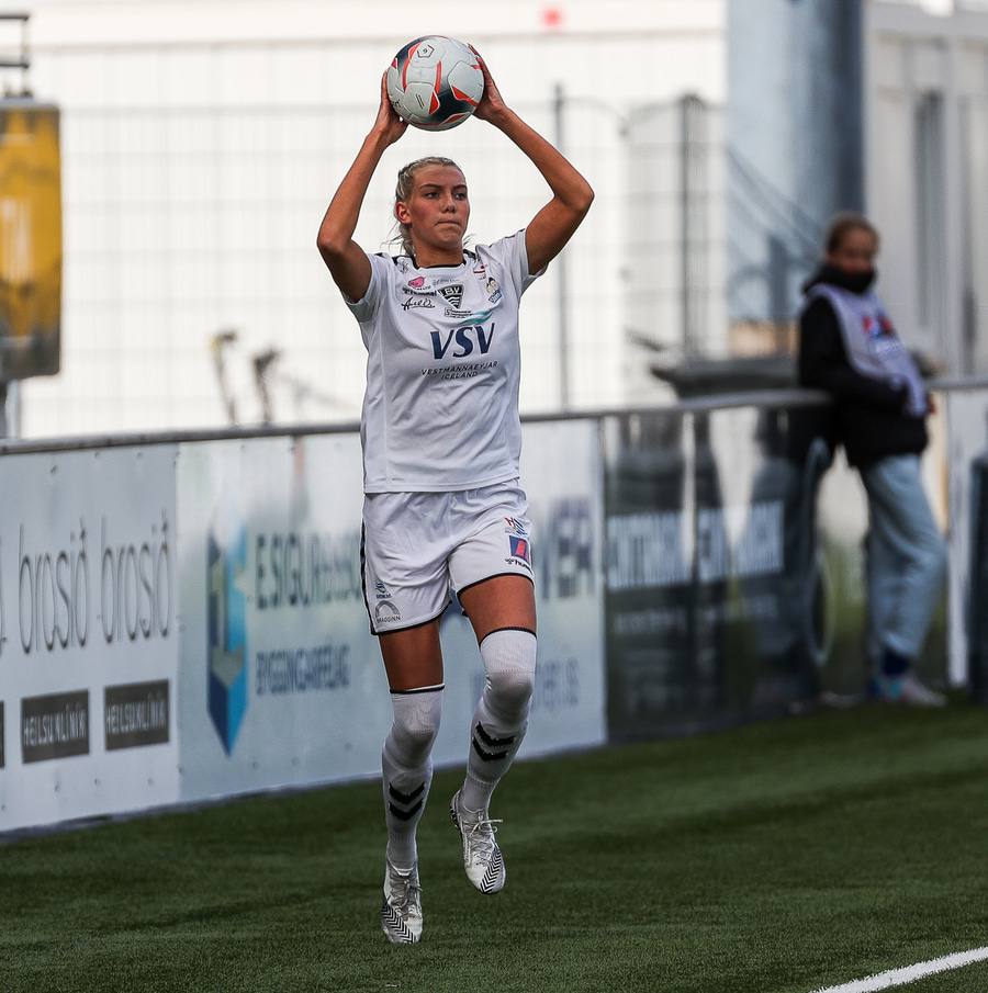 Hildigunnur með sprett upp vinstri kantinn en kemst ekki framhjá Liönu Hinds sem kemur þessu í innkast.