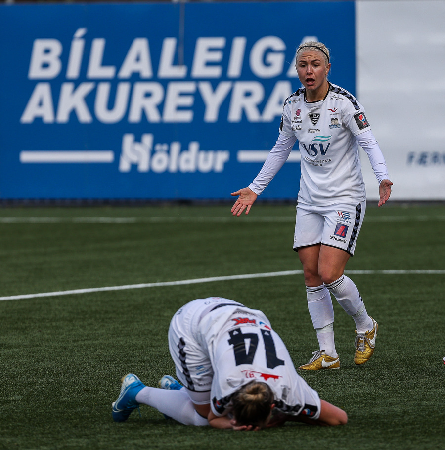 Delaney liggur eftir tæklingu frá Ingibjörgu Lúícu.