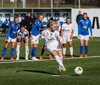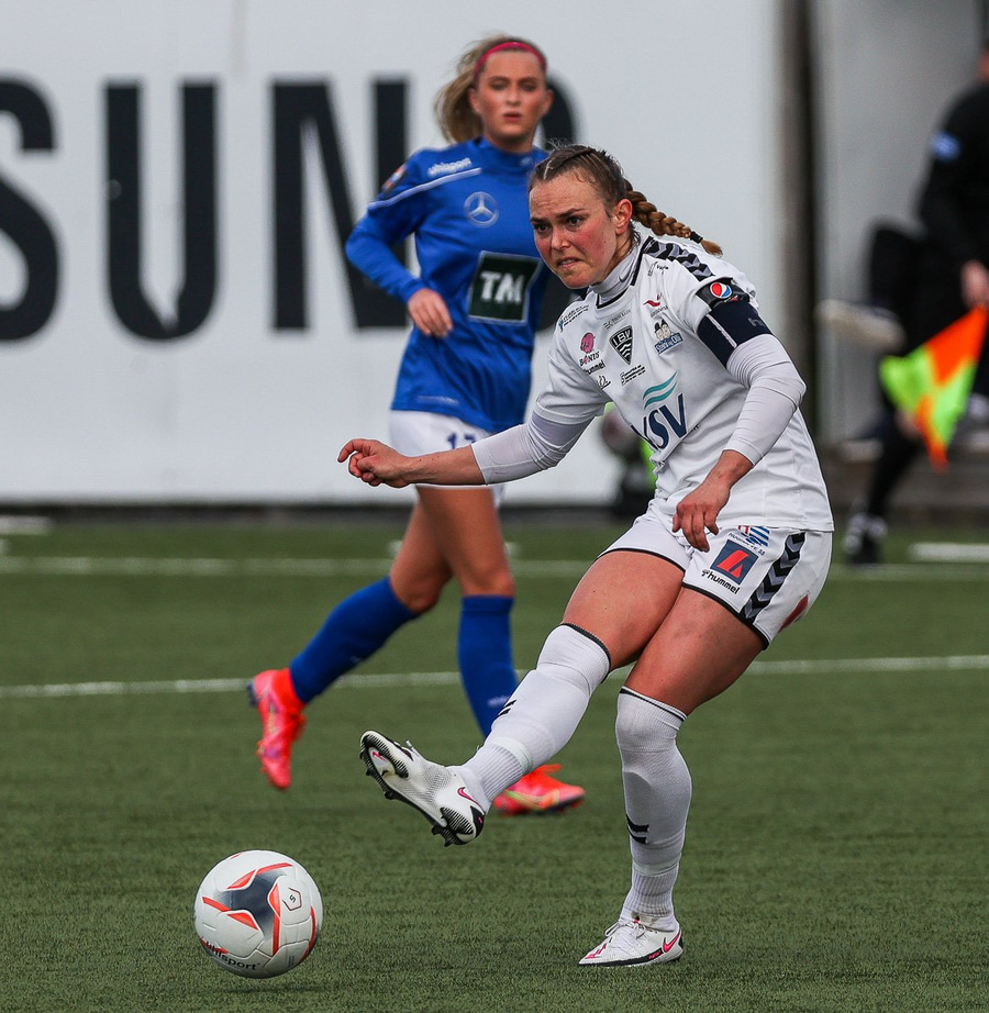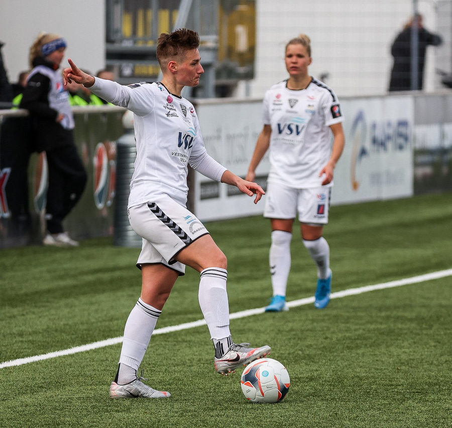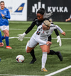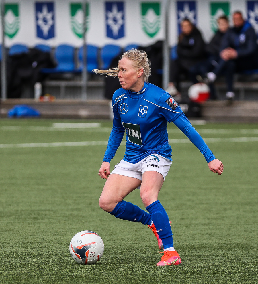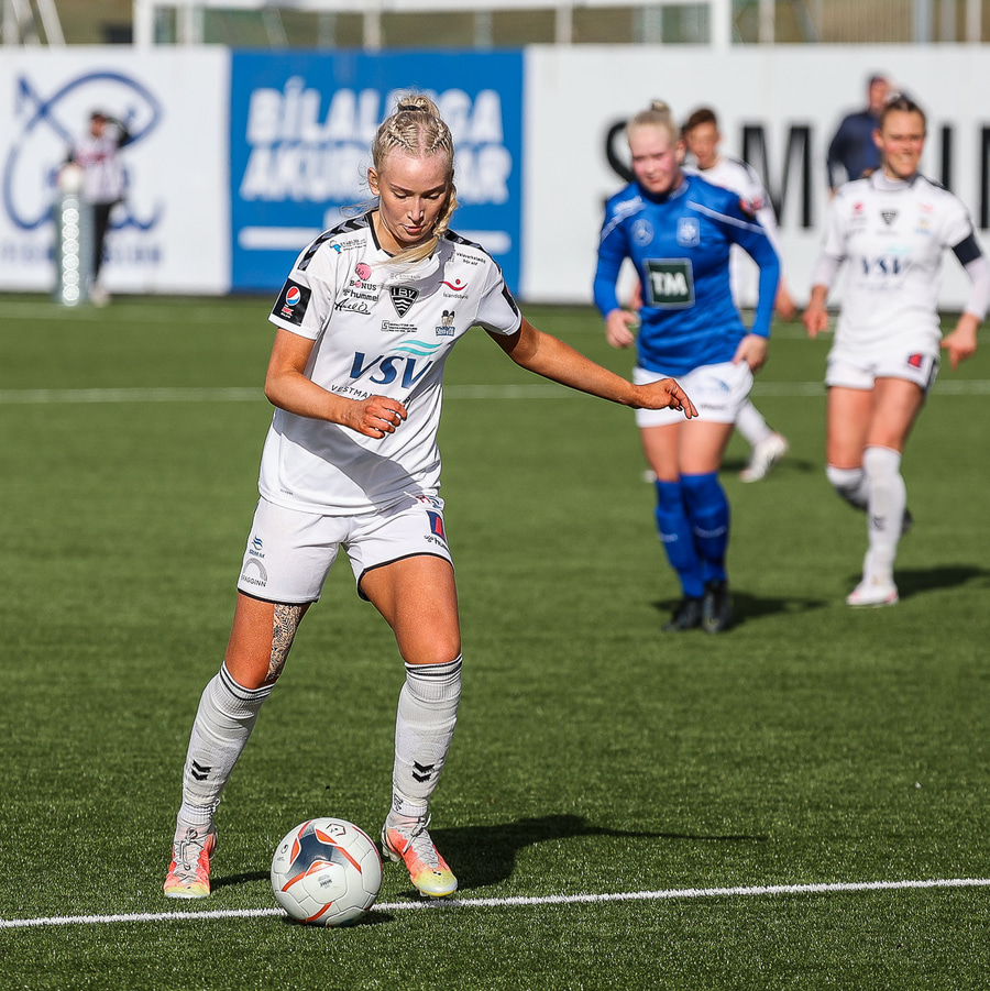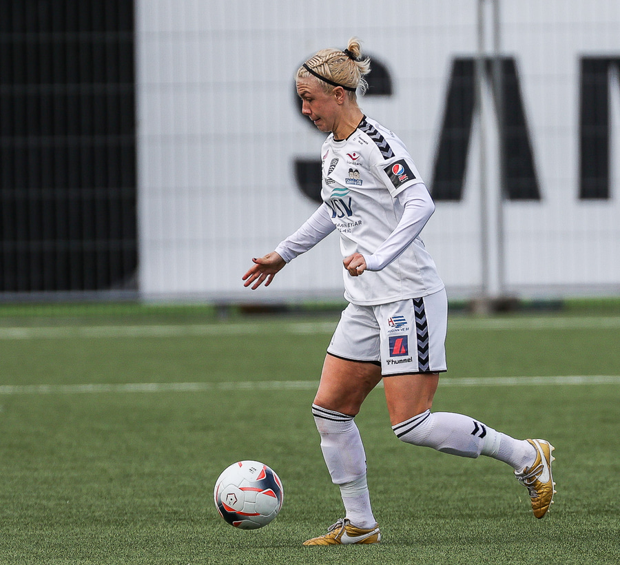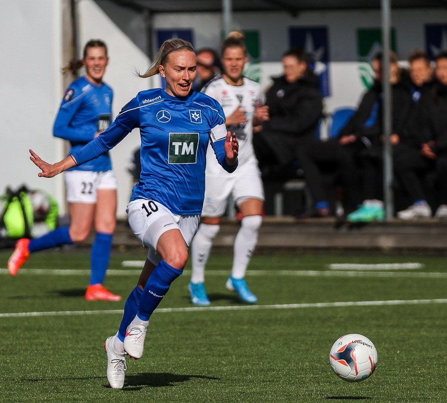 Kristjana fær boltann úti á kanti og reynir fyrirgjöf sem fer af varnarmanni og aftur fyrir.
