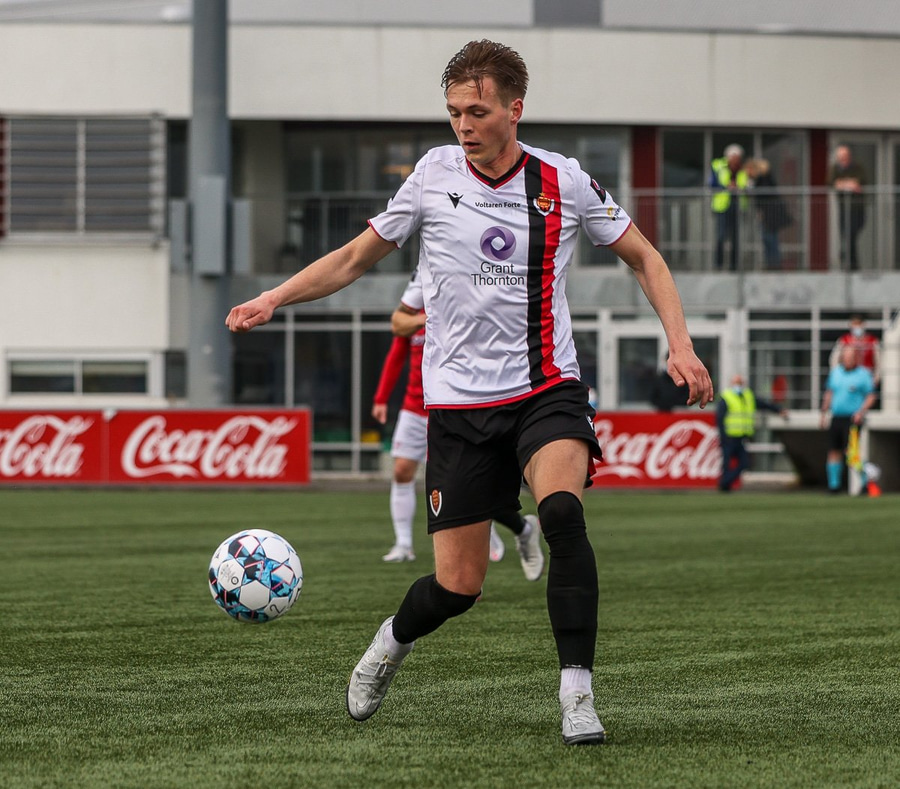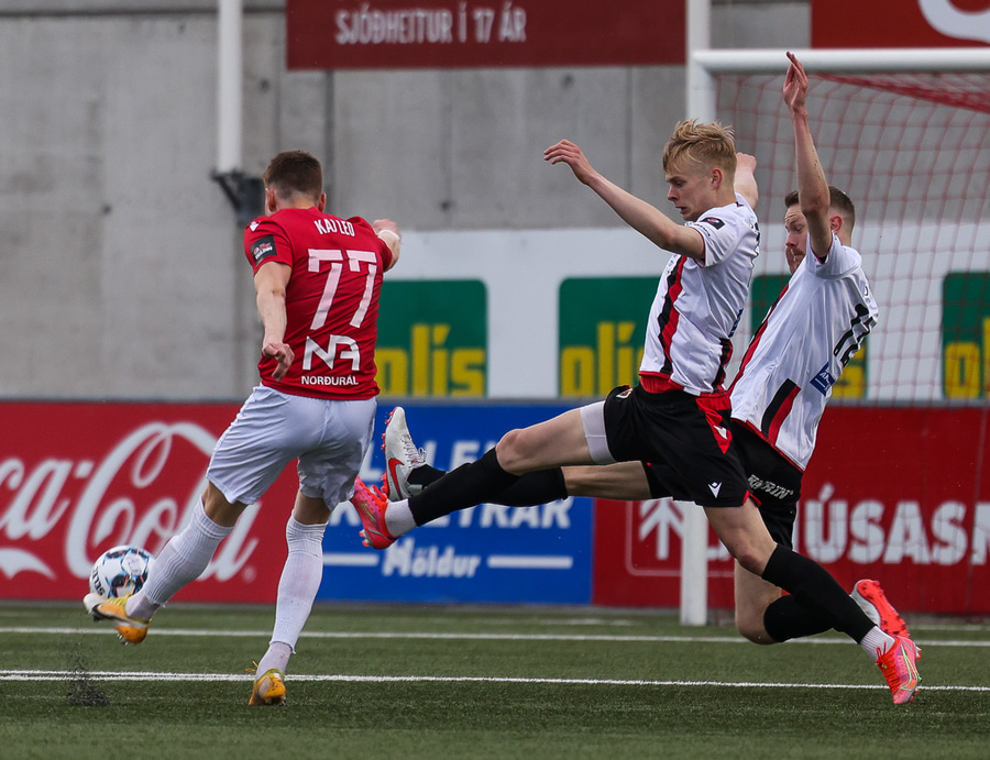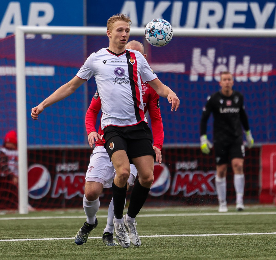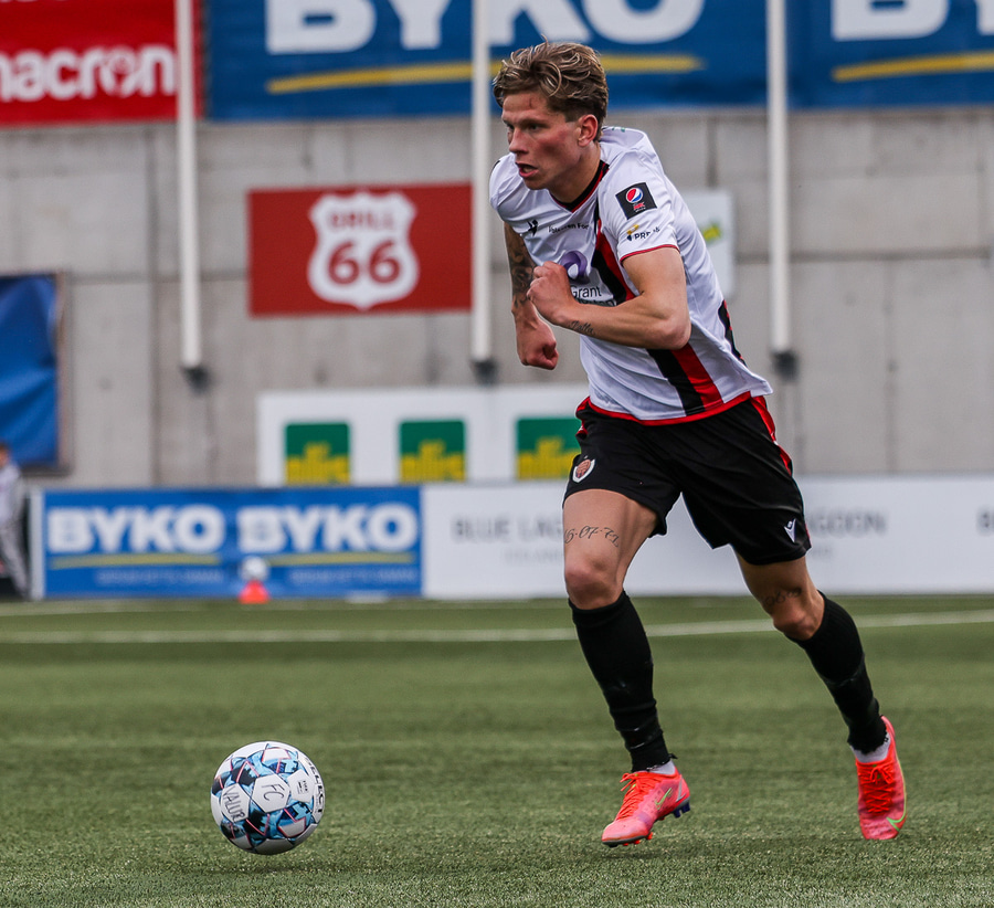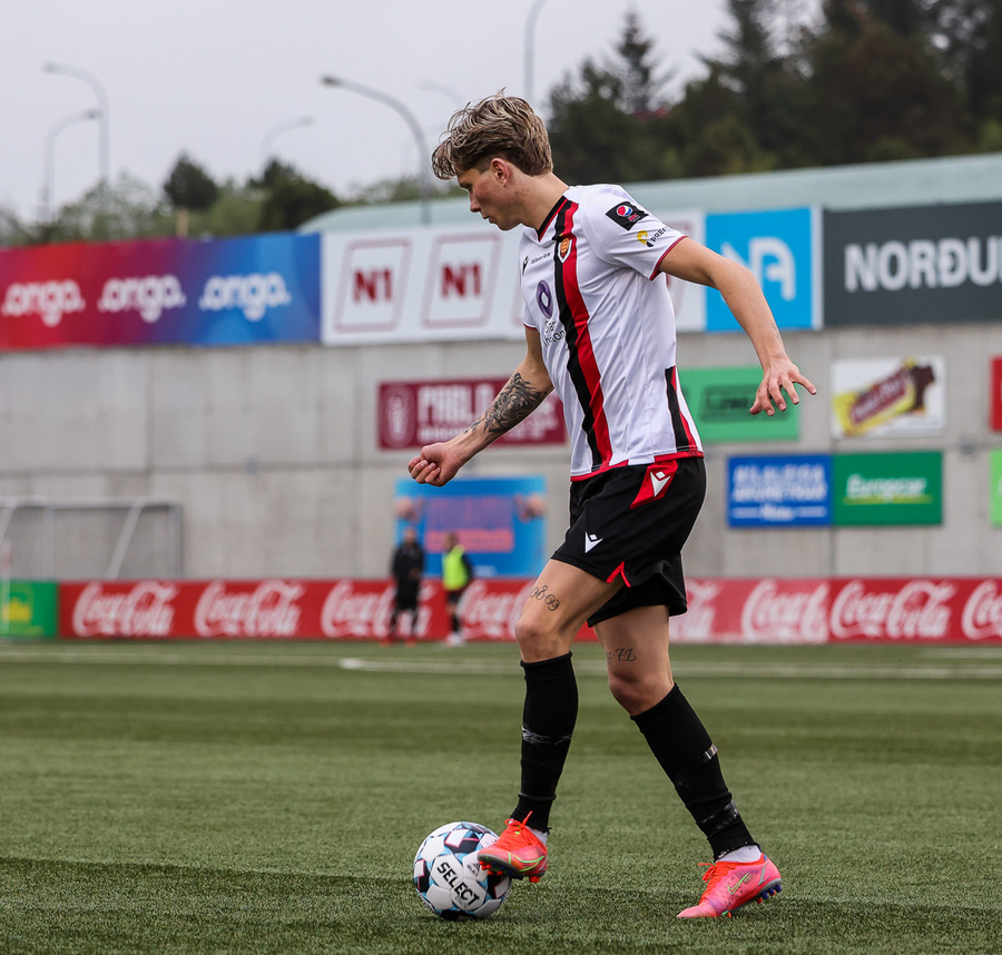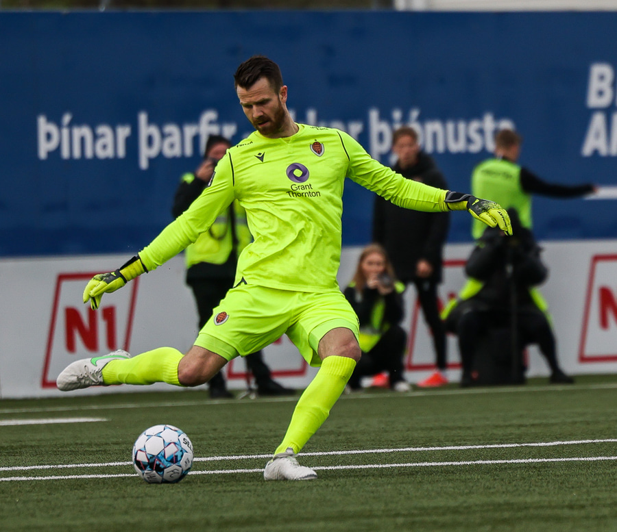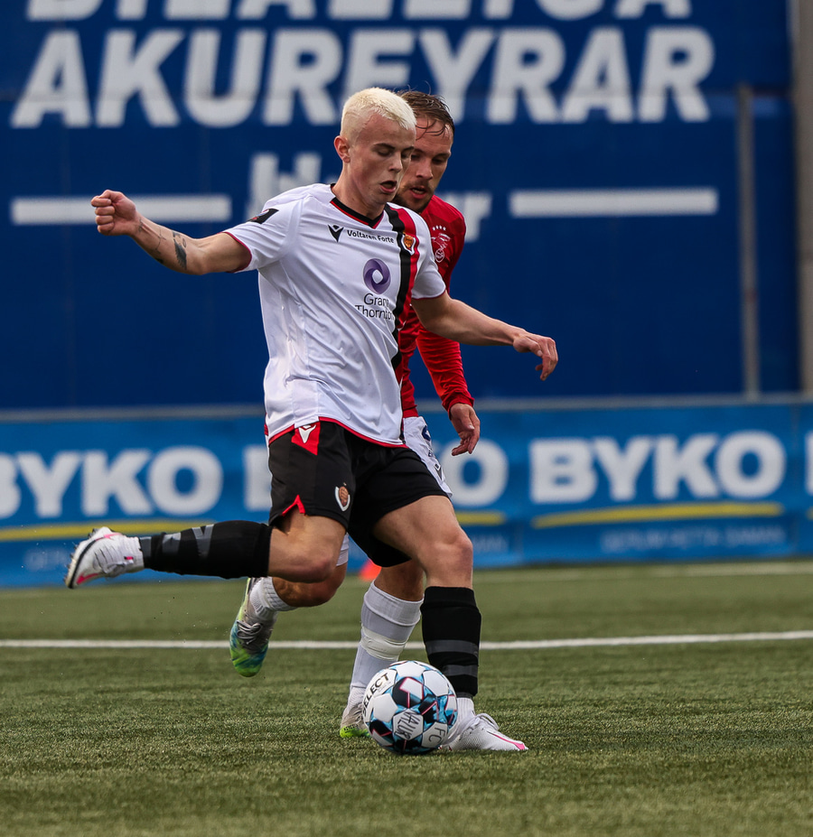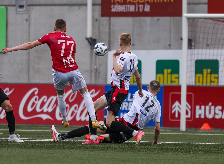 Viktor Örlygur fær boltann við miðjuhringinn og lyftirboltanum skemmtilega fyrir á Nikolaj sem nær ekki til boltans og Hannes Þór grípur boltann.