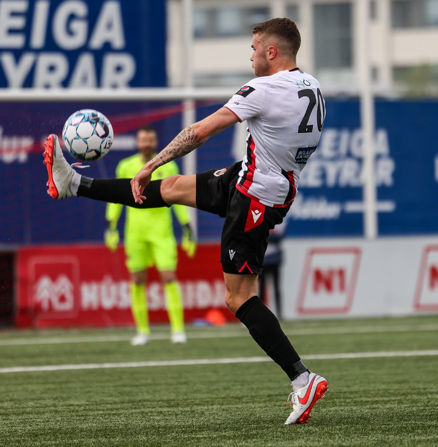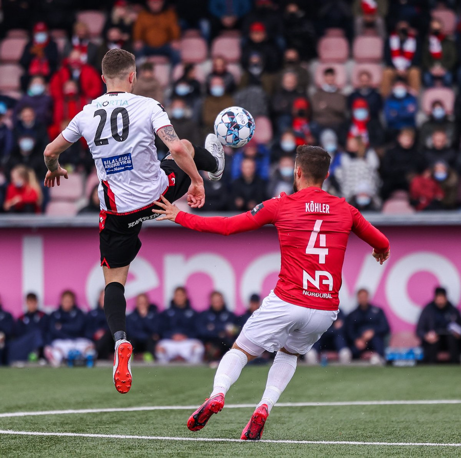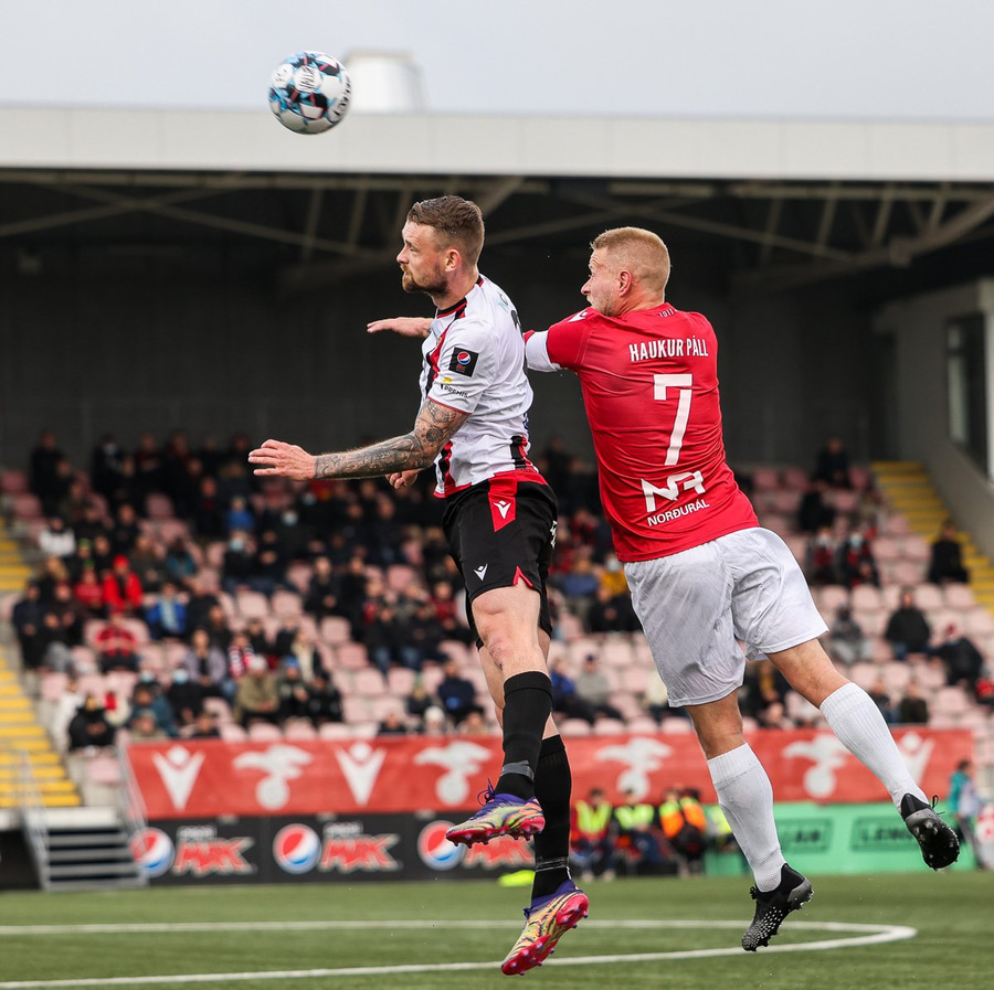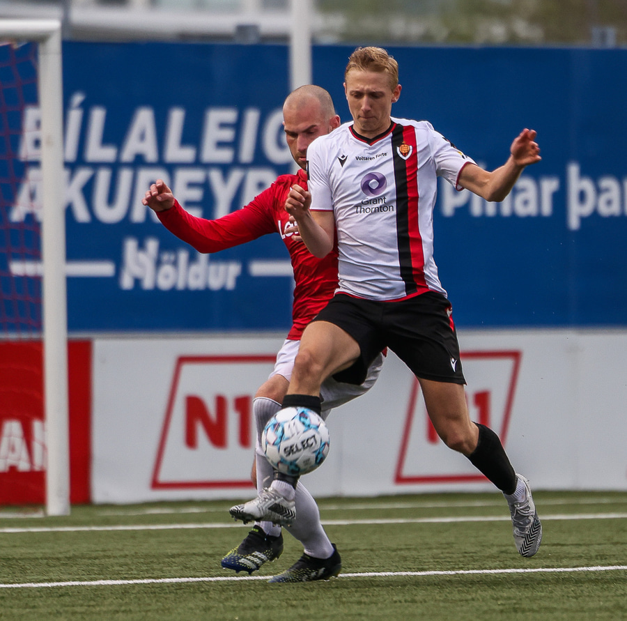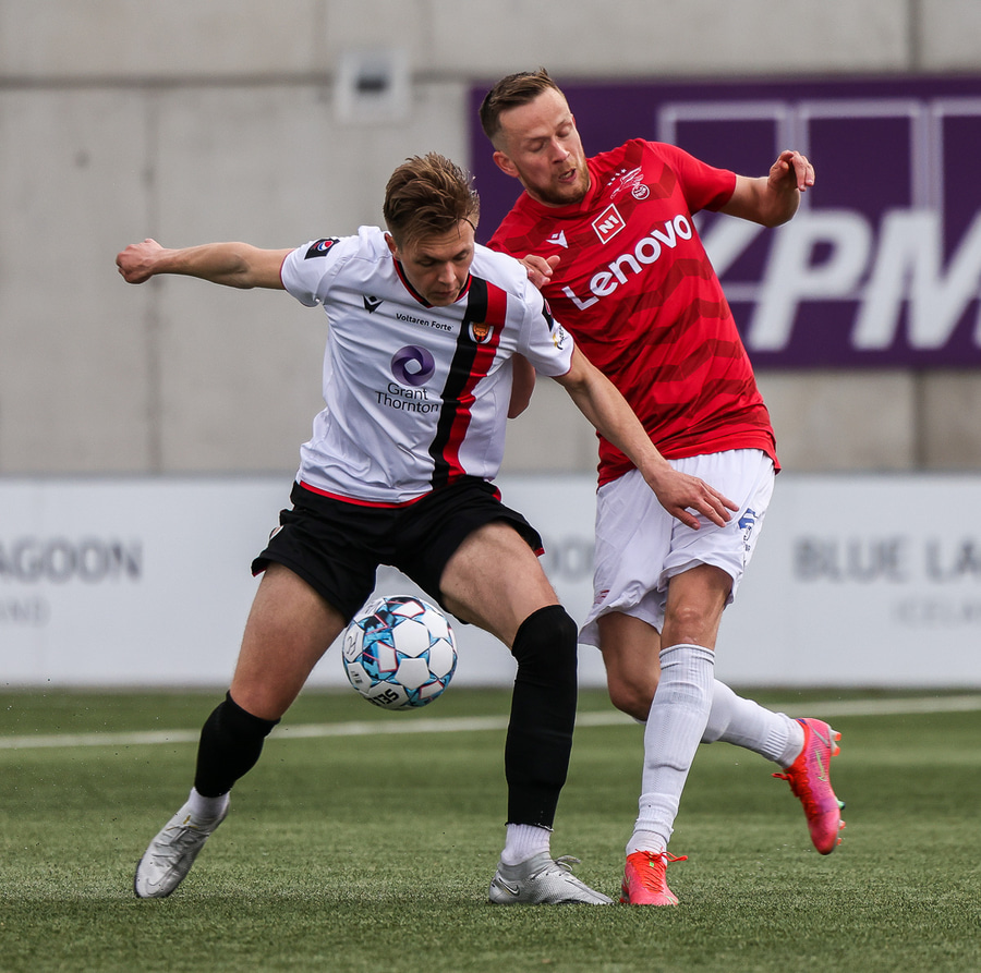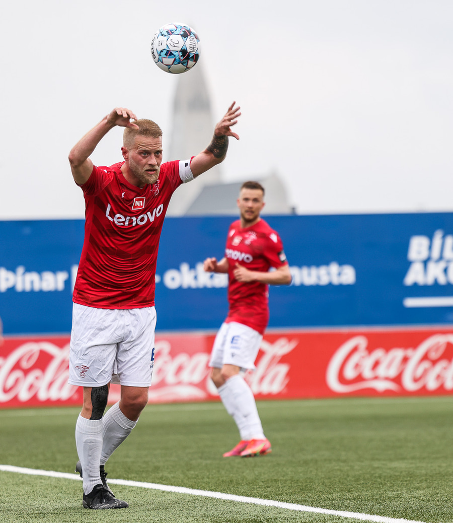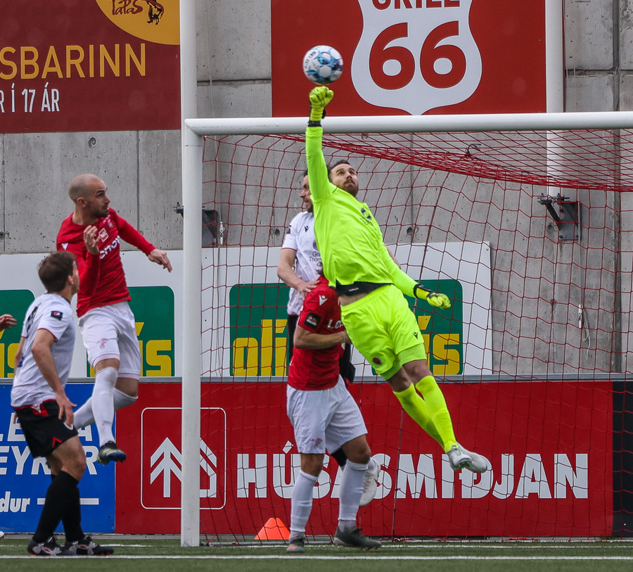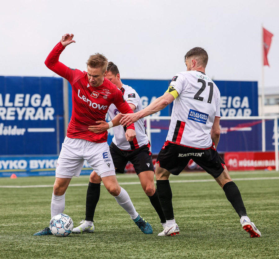 Viktor Örlygur fær boltann við miðjuhringinn og lyftirboltanum skemmtilega fyrir á Nikolaj sem nær ekki til boltans og Hannes Þór grípur boltann.