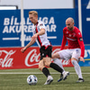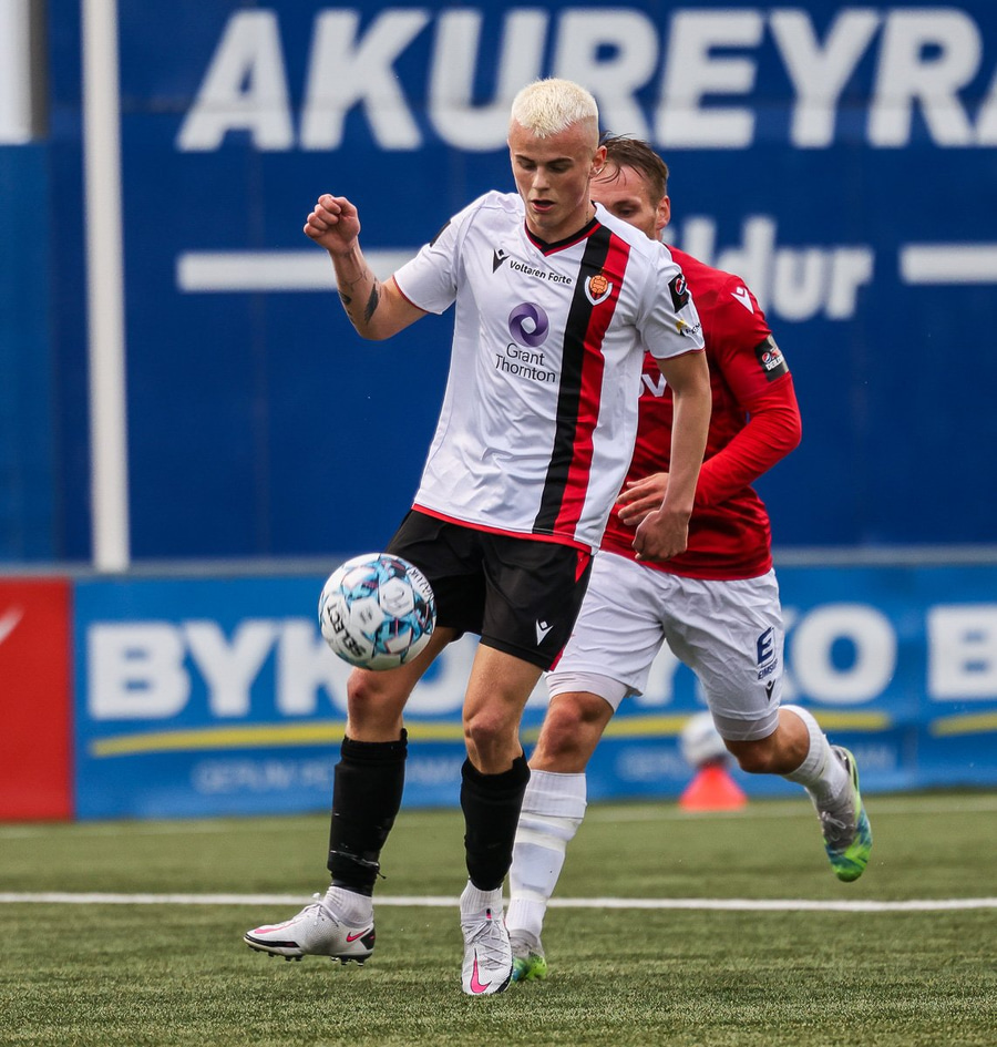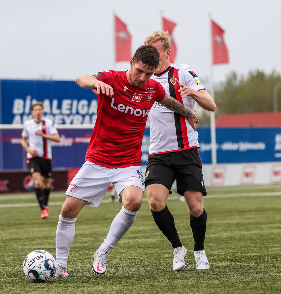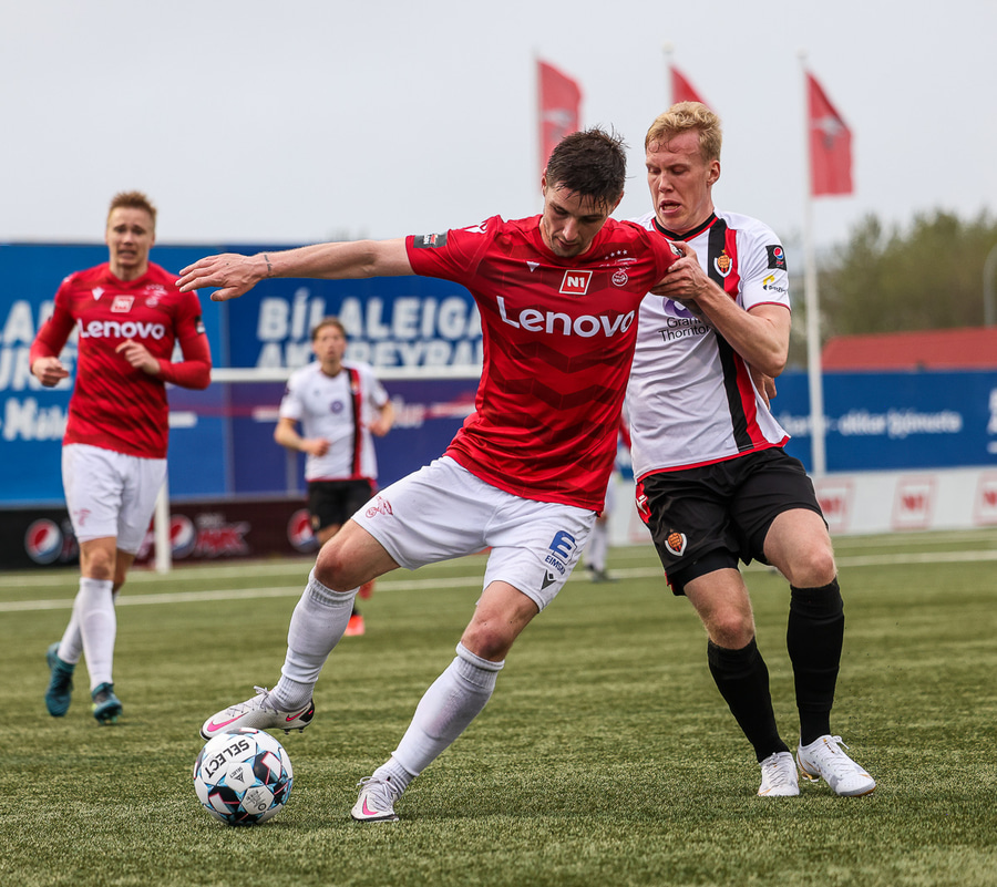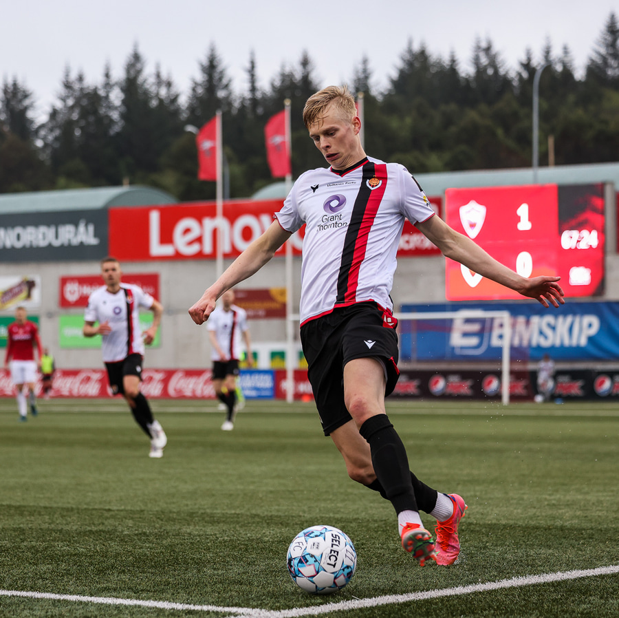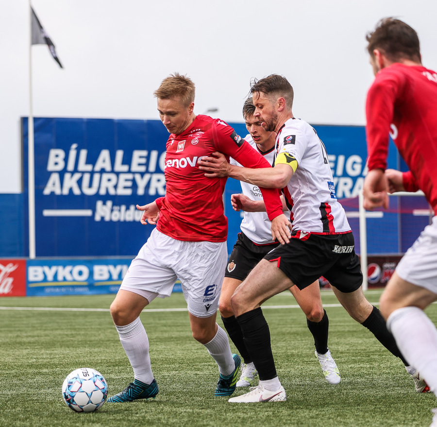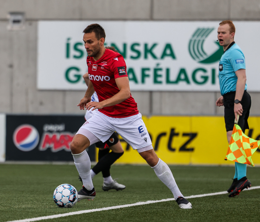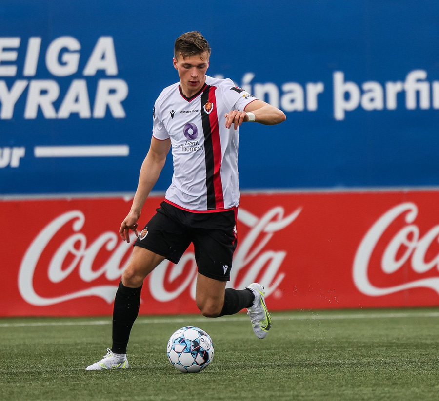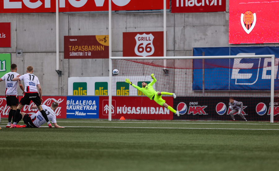 Viktor Örlygur fær boltann við miðjuhringinn og lyftirboltanum skemmtilega fyrir á Nikolaj sem nær ekki til boltans og Hannes Þór grípur boltann.