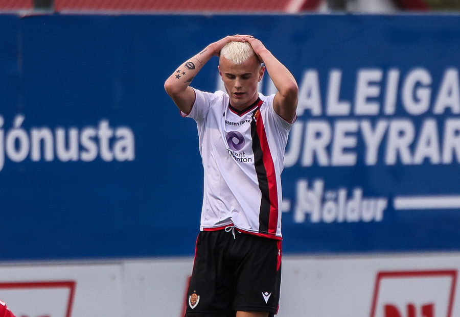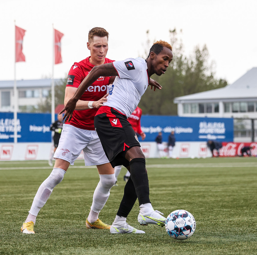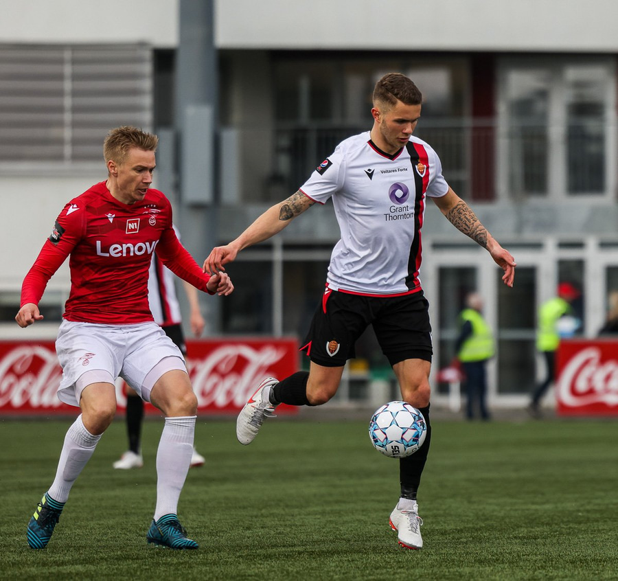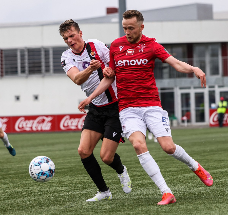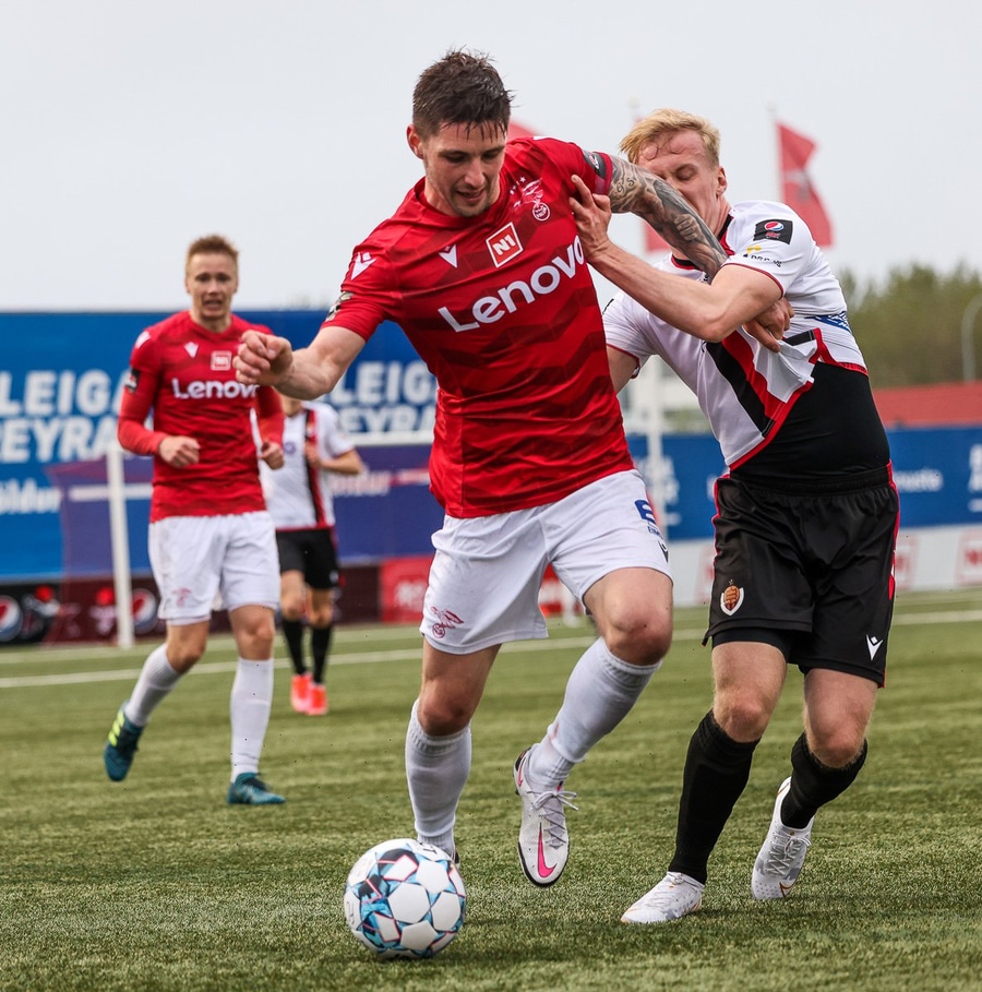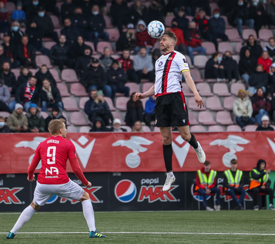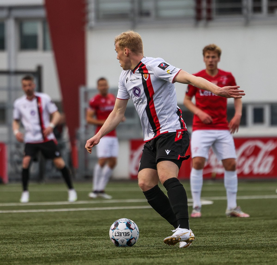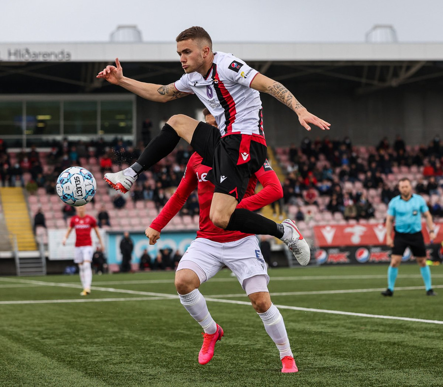 Viktor Örlygur fær boltann við miðjuhringinn og lyftirboltanum skemmtilega fyrir á Nikolaj sem nær ekki til boltans og Hannes Þór grípur boltann.