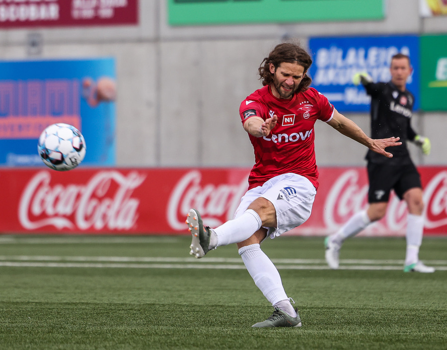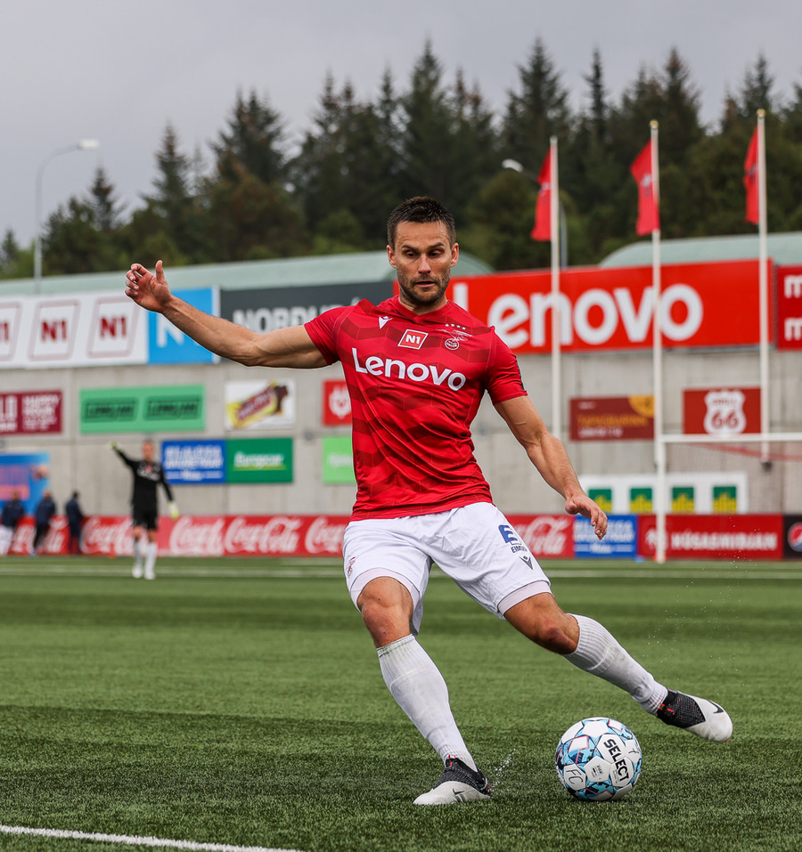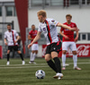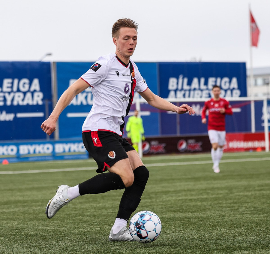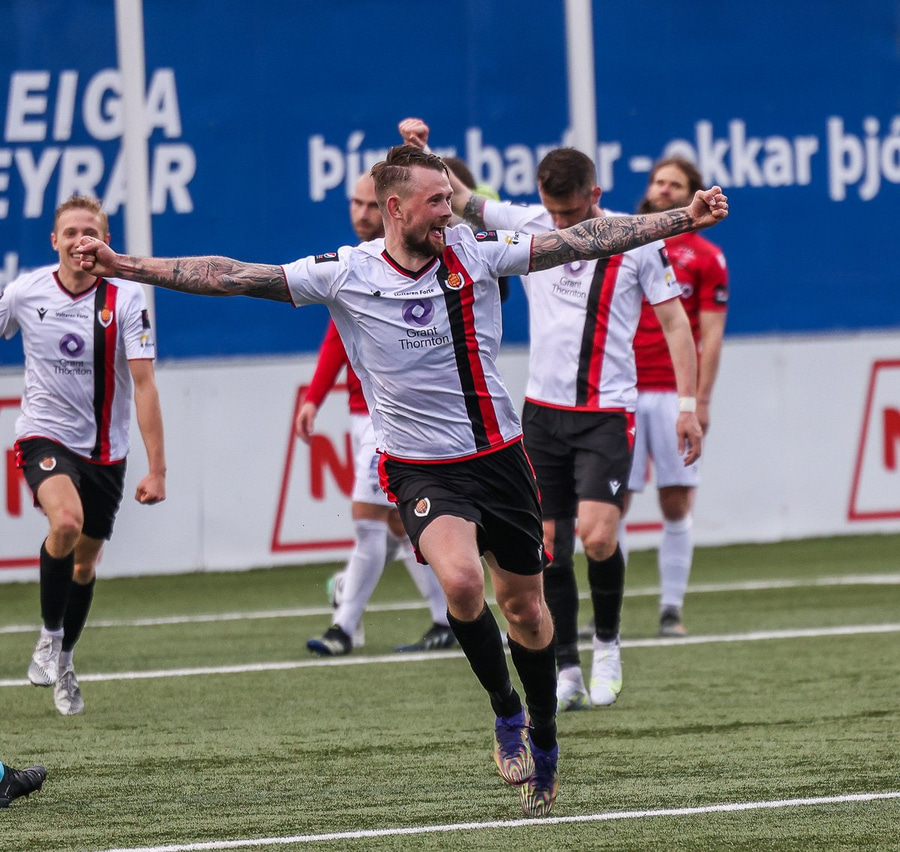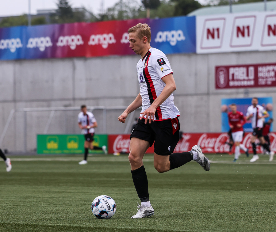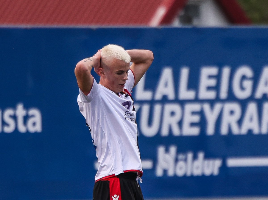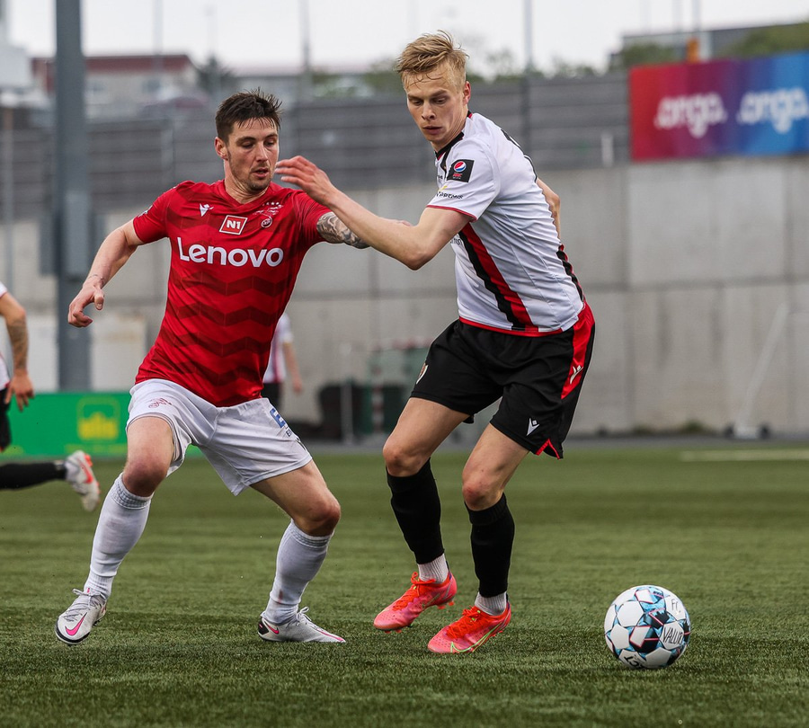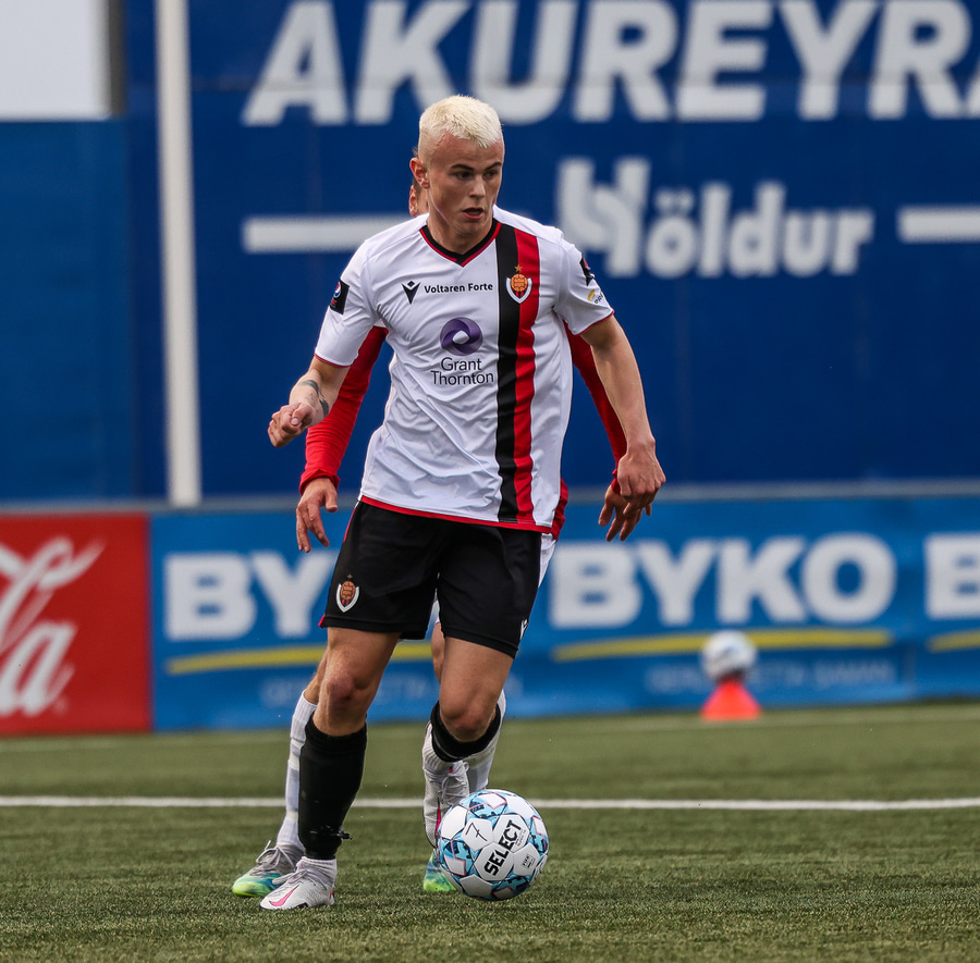Viktor Örlygur fær boltann við miðjuhringinn og lyftirboltanum skemmtilega fyrir á Nikolaj sem nær ekki til boltans og Hannes Þór grípur boltann.