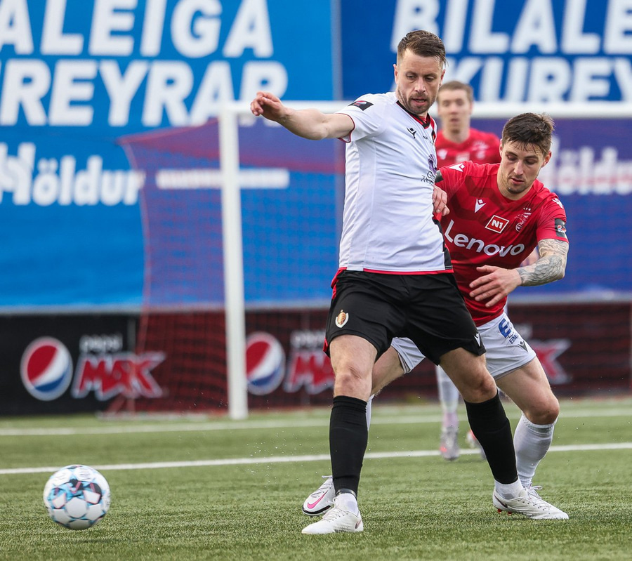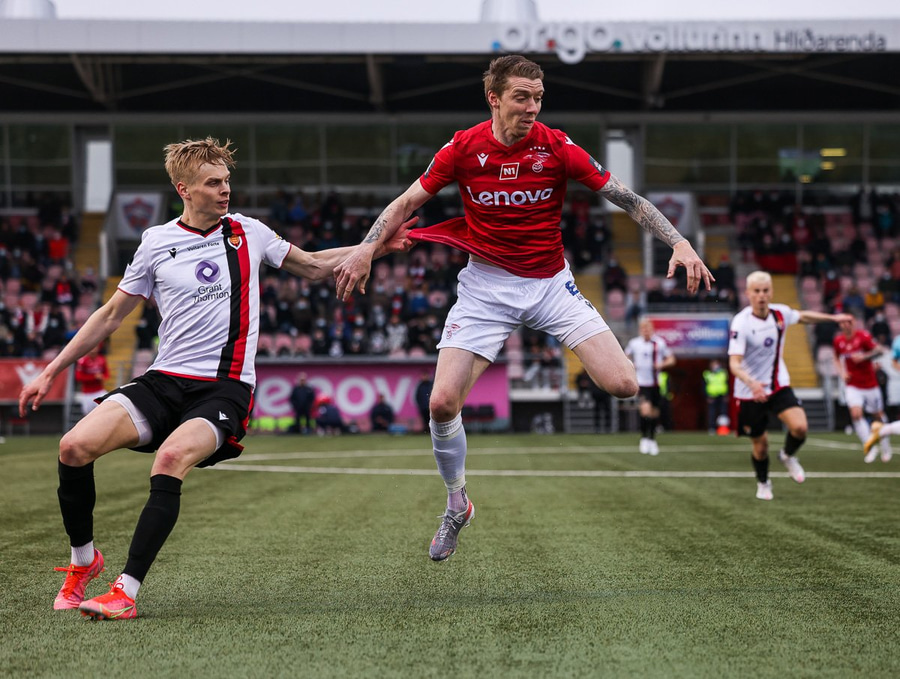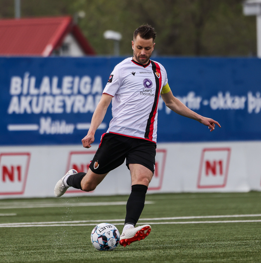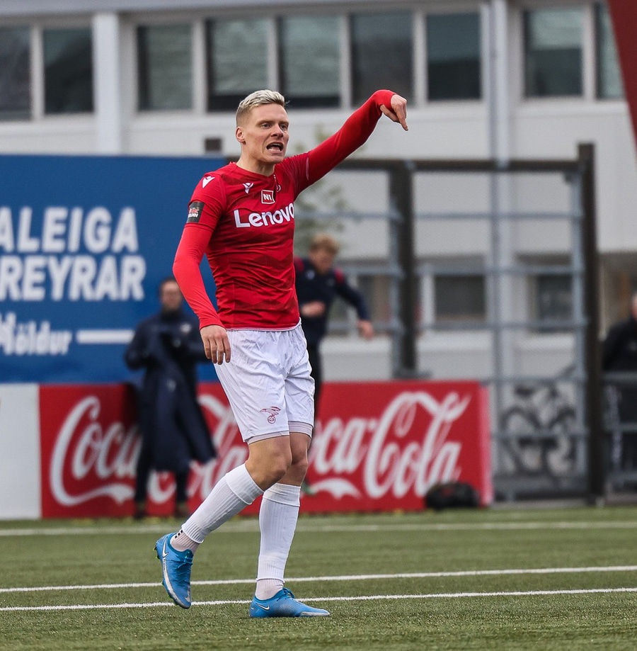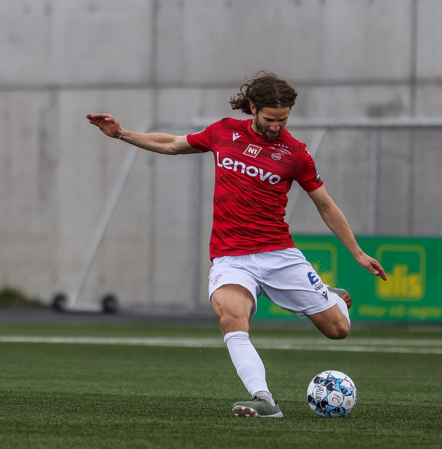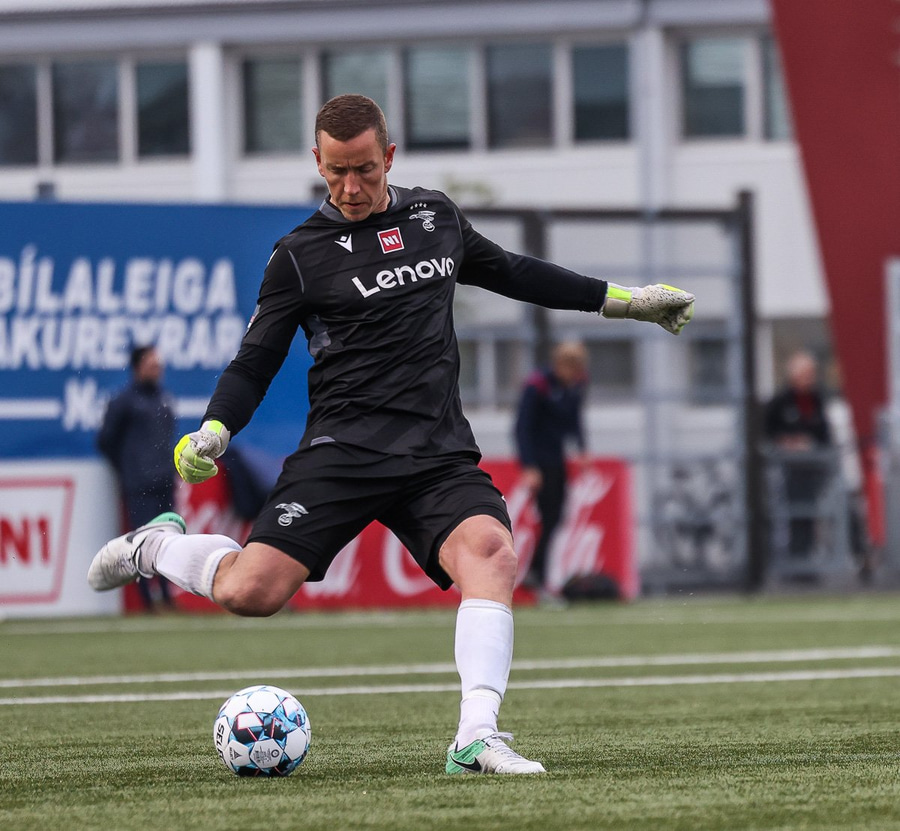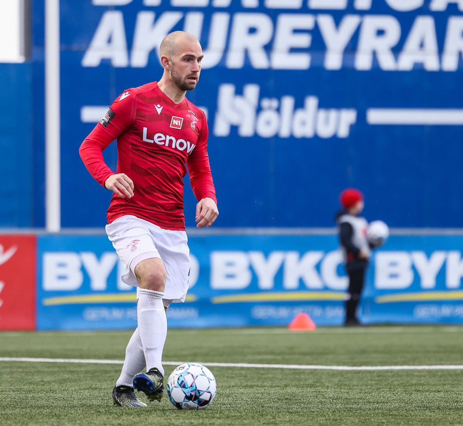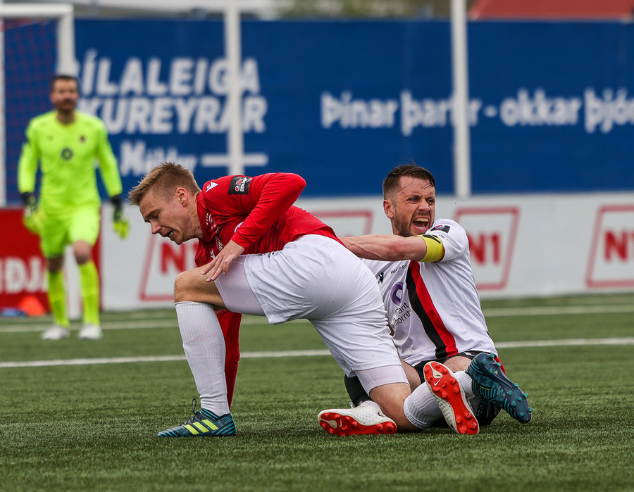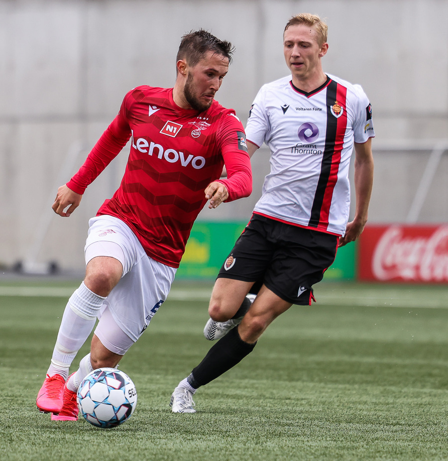 Viktor Örlygur fær boltann við miðjuhringinn og lyftirboltanum skemmtilega fyrir á Nikolaj sem nær ekki til boltans og Hannes Þór grípur boltann.