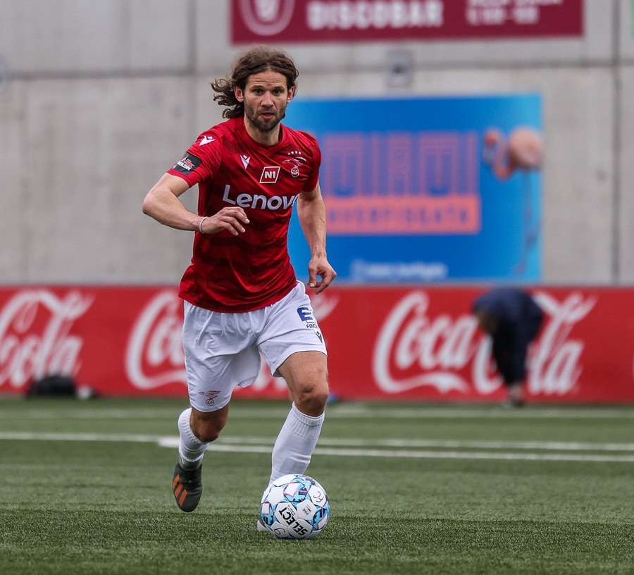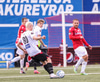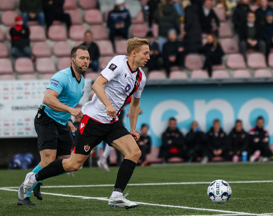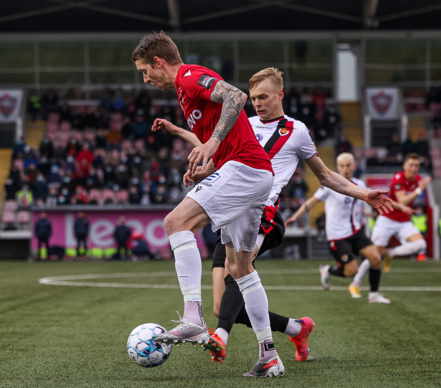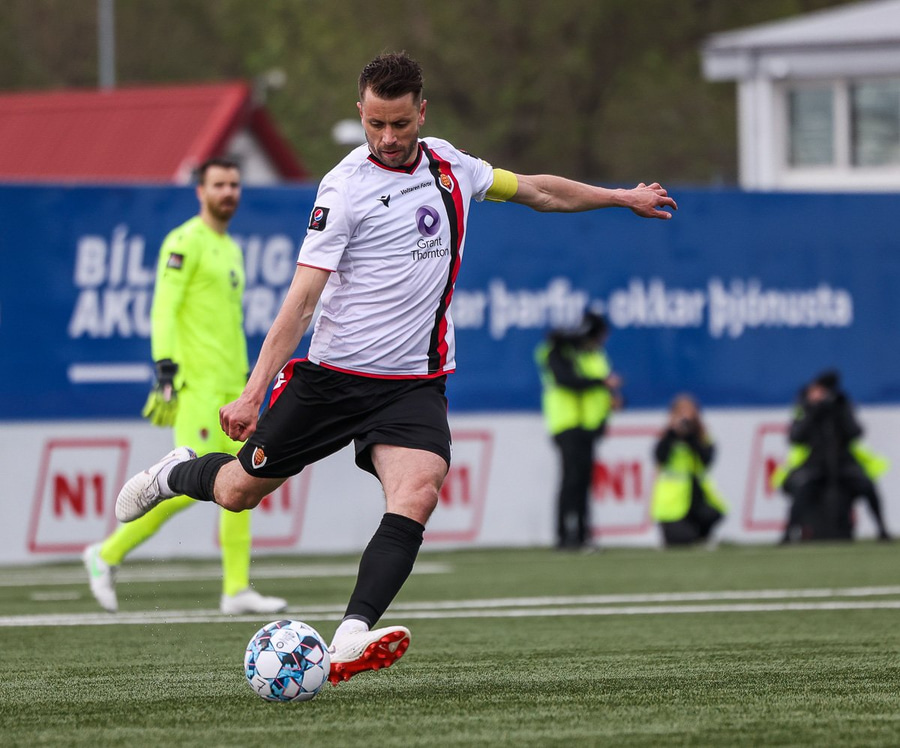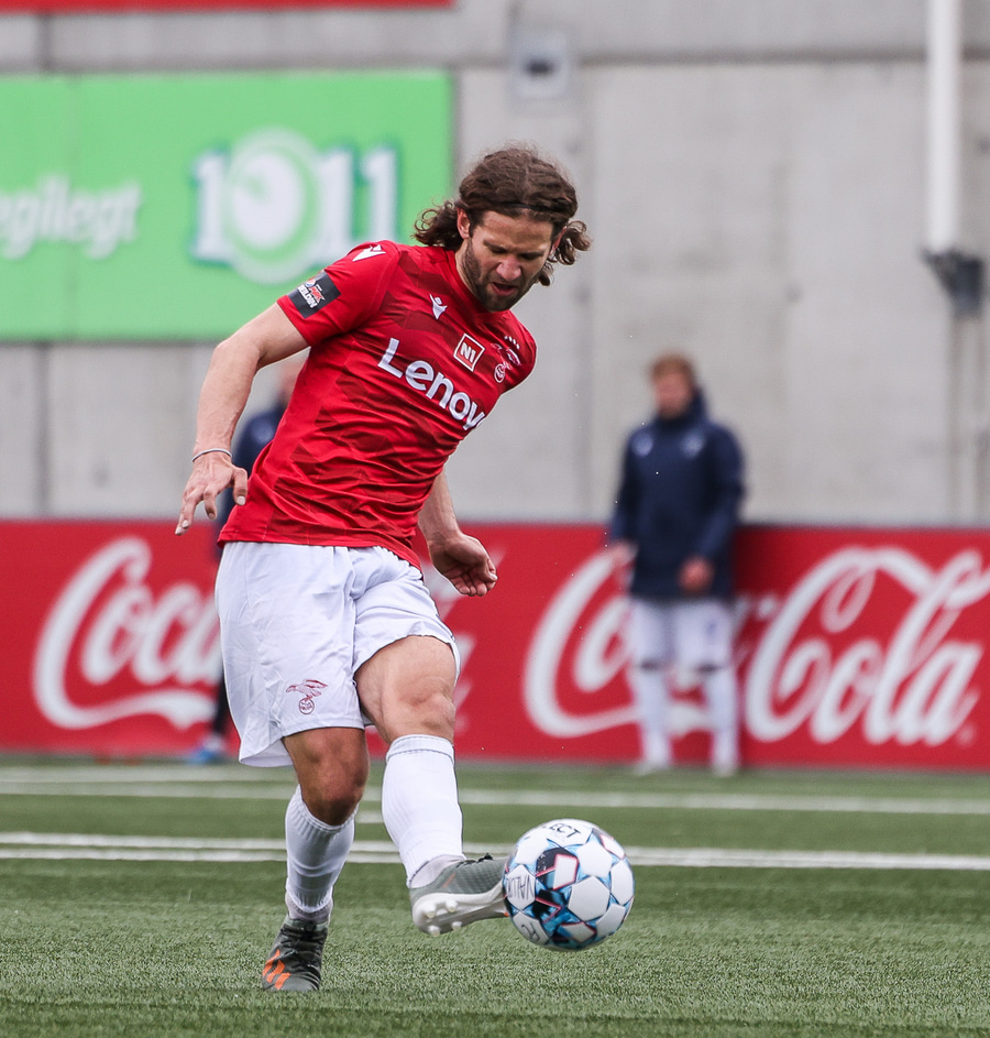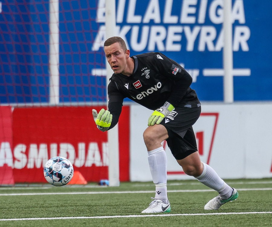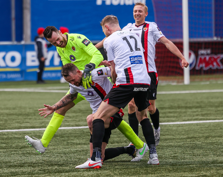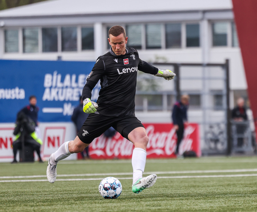 Viktor Örlygur fær boltann við miðjuhringinn og lyftirboltanum skemmtilega fyrir á Nikolaj sem nær ekki til boltans og Hannes Þór grípur boltann.