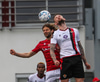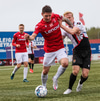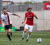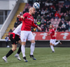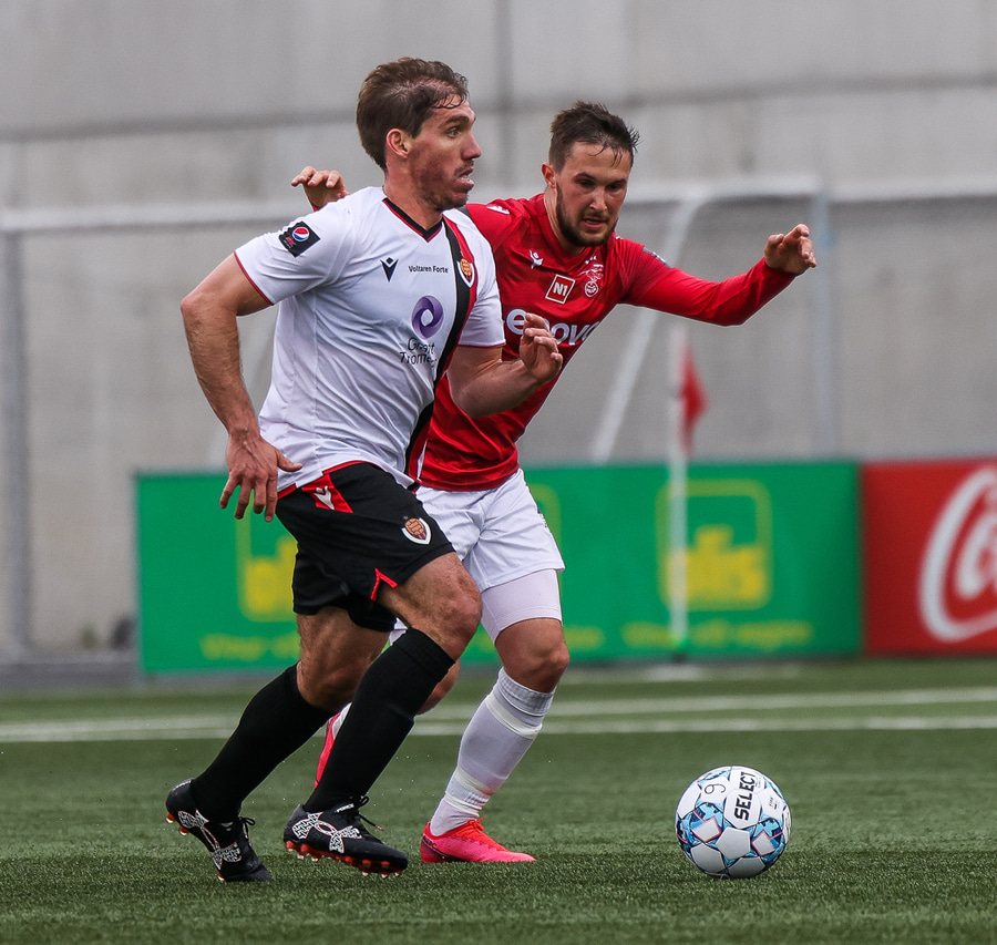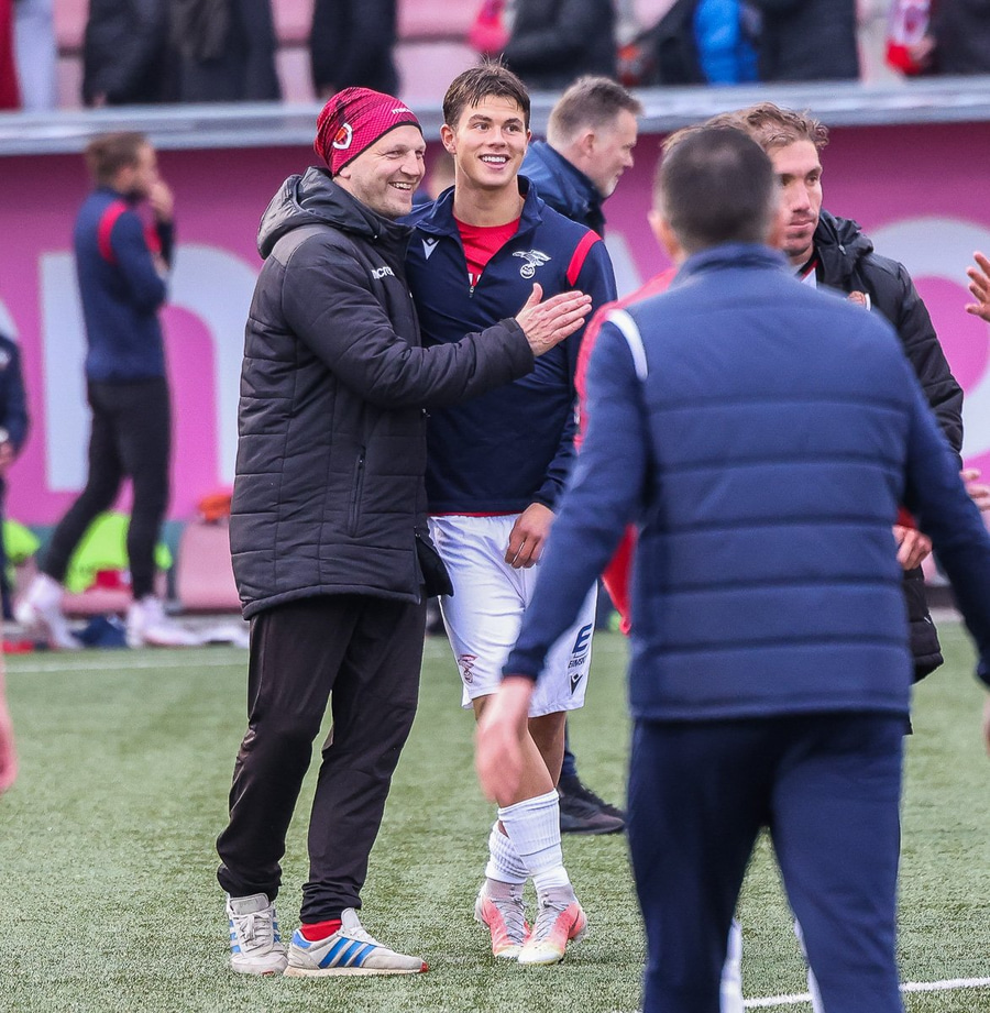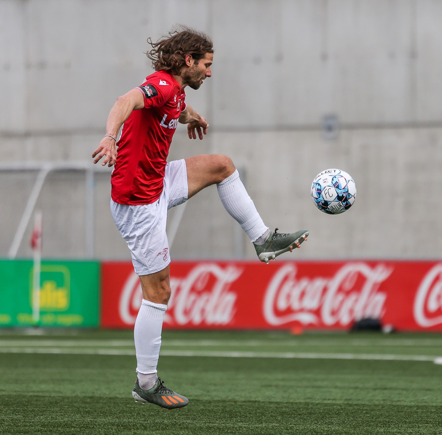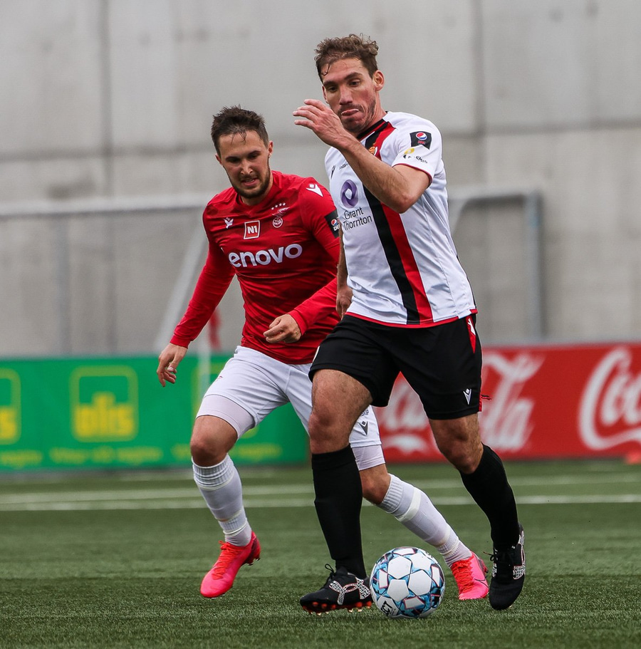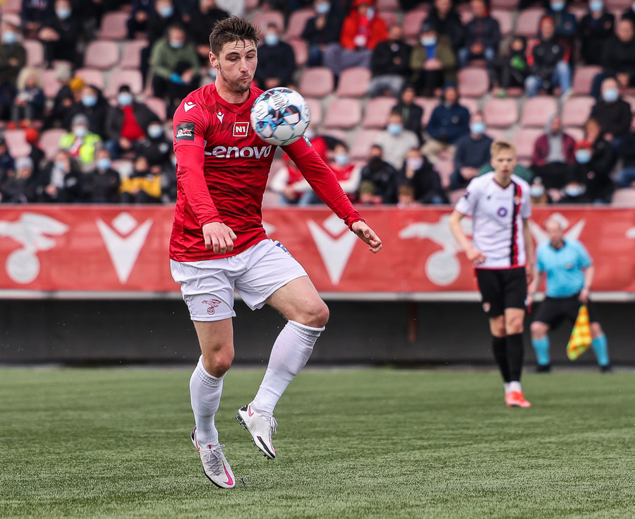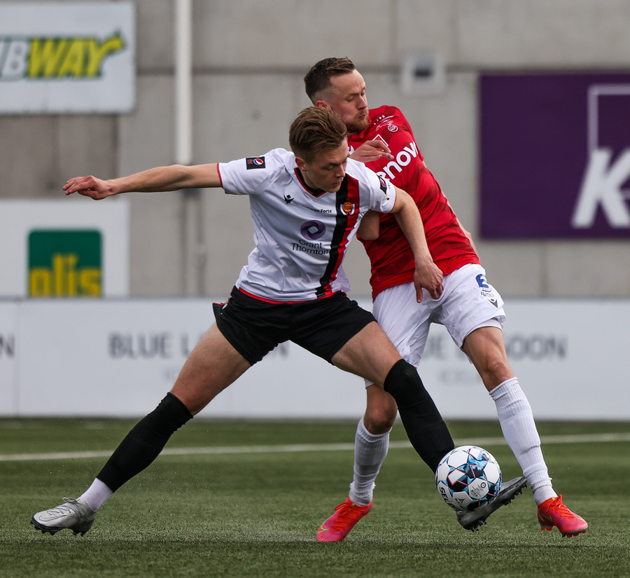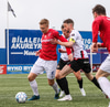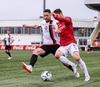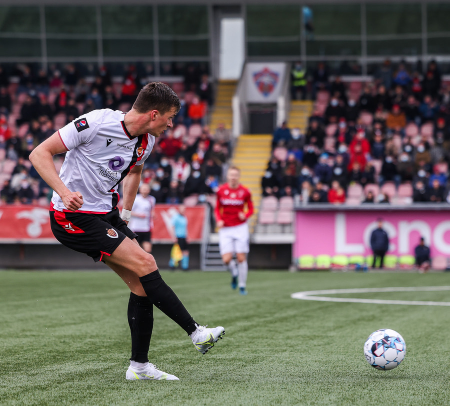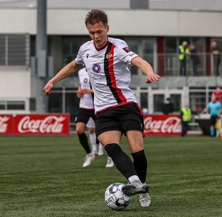 Viktor Örlygur fær boltann við miðjuhringinn og lyftirboltanum skemmtilega fyrir á Nikolaj sem nær ekki til boltans og Hannes Þór grípur boltann.