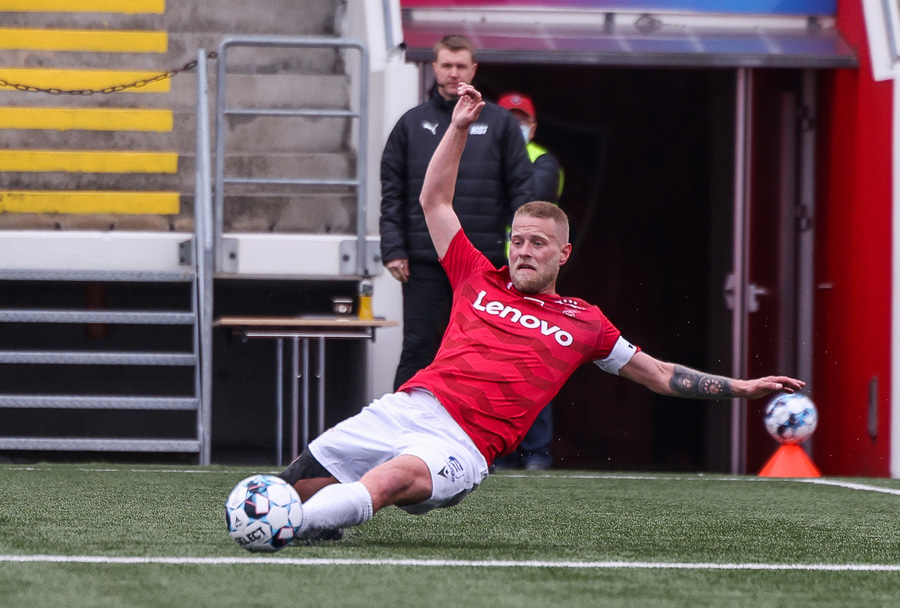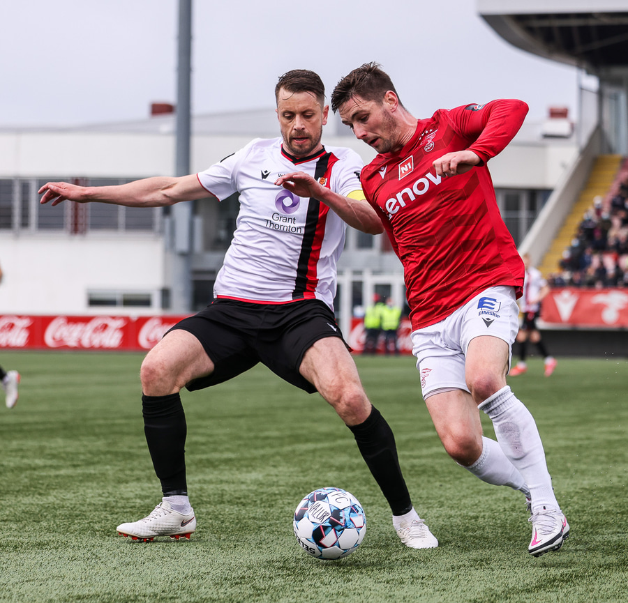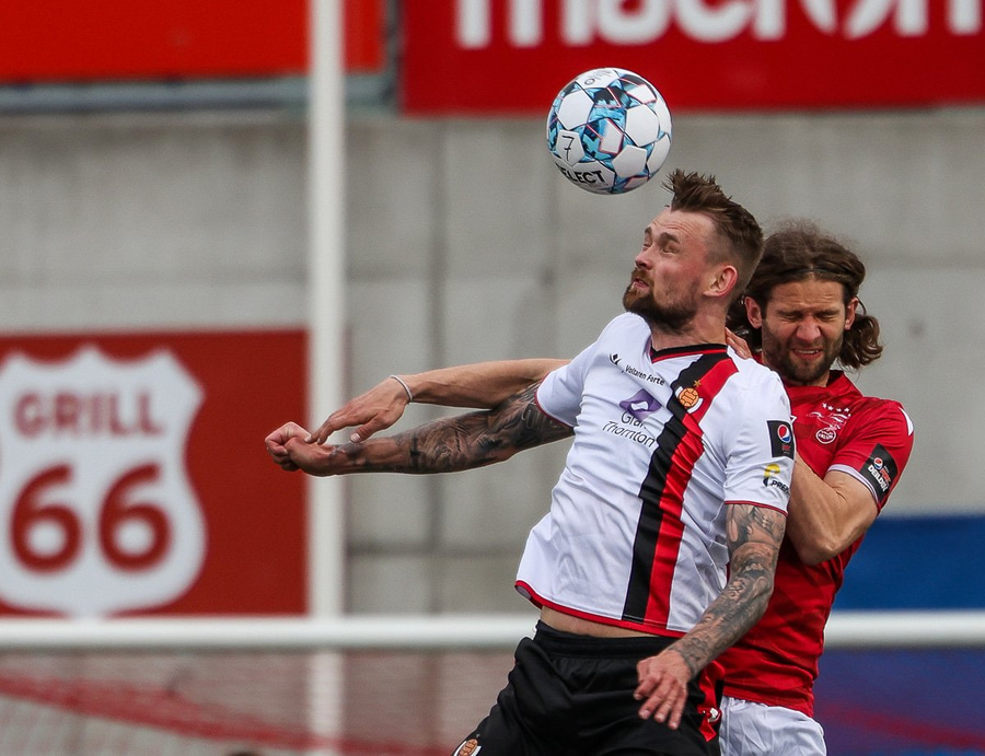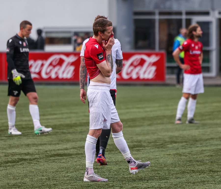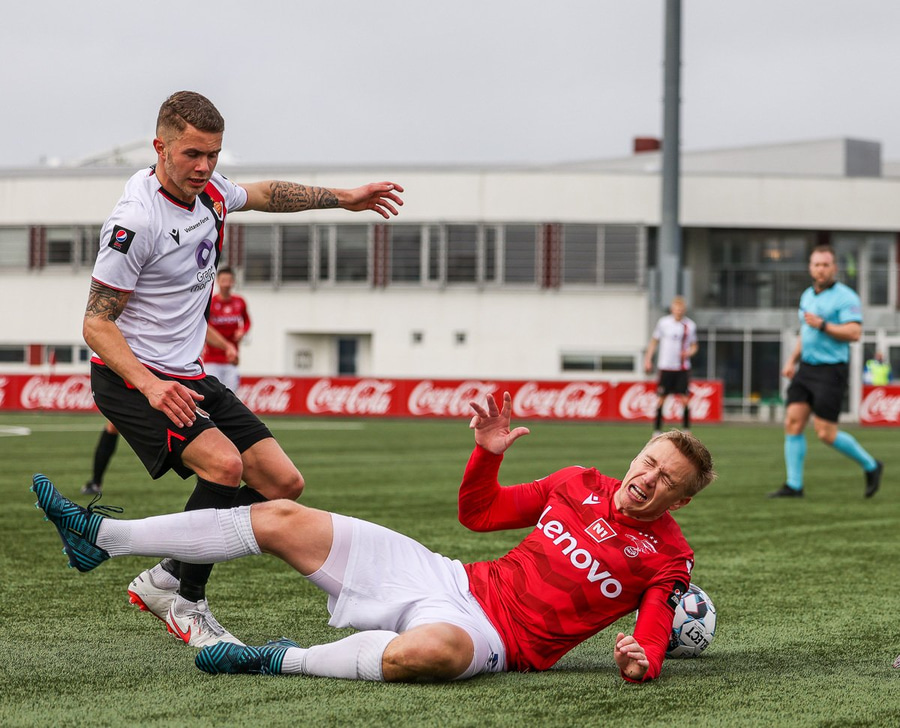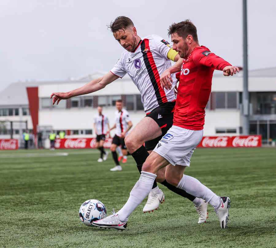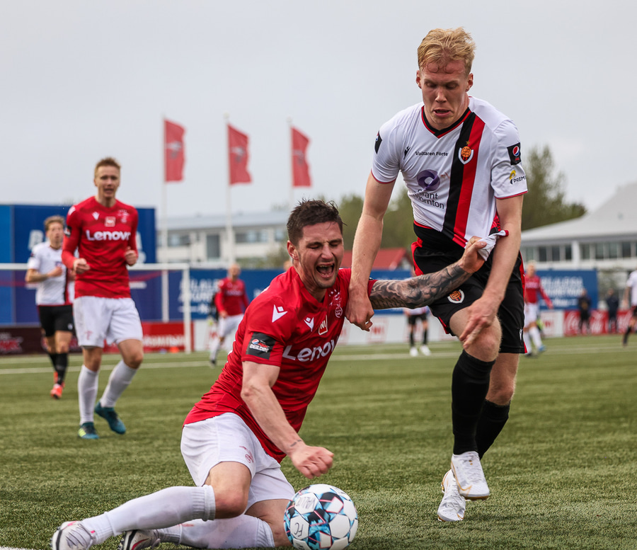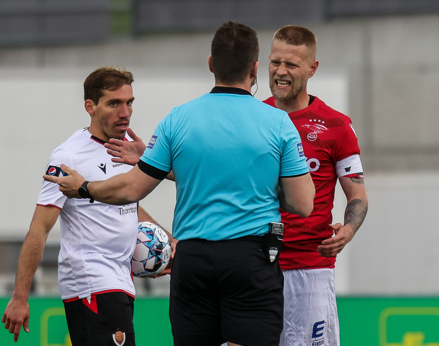 Rasmus lyftir boltanum inn fyrir á Sigga Lár og Þórður kemur á ferðinni og ætlar að koma boltanum í burtu en mistekst það og Siggi Lár kemst í boltann en Þórður Ingason klippir hann niður.