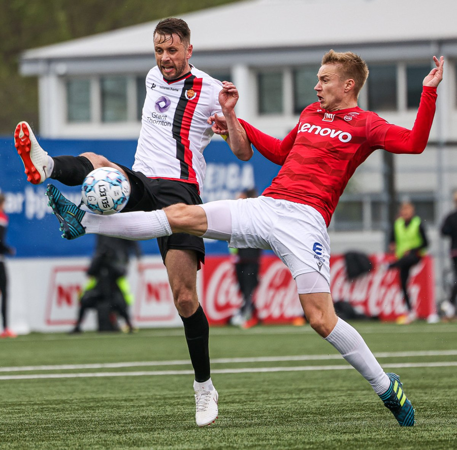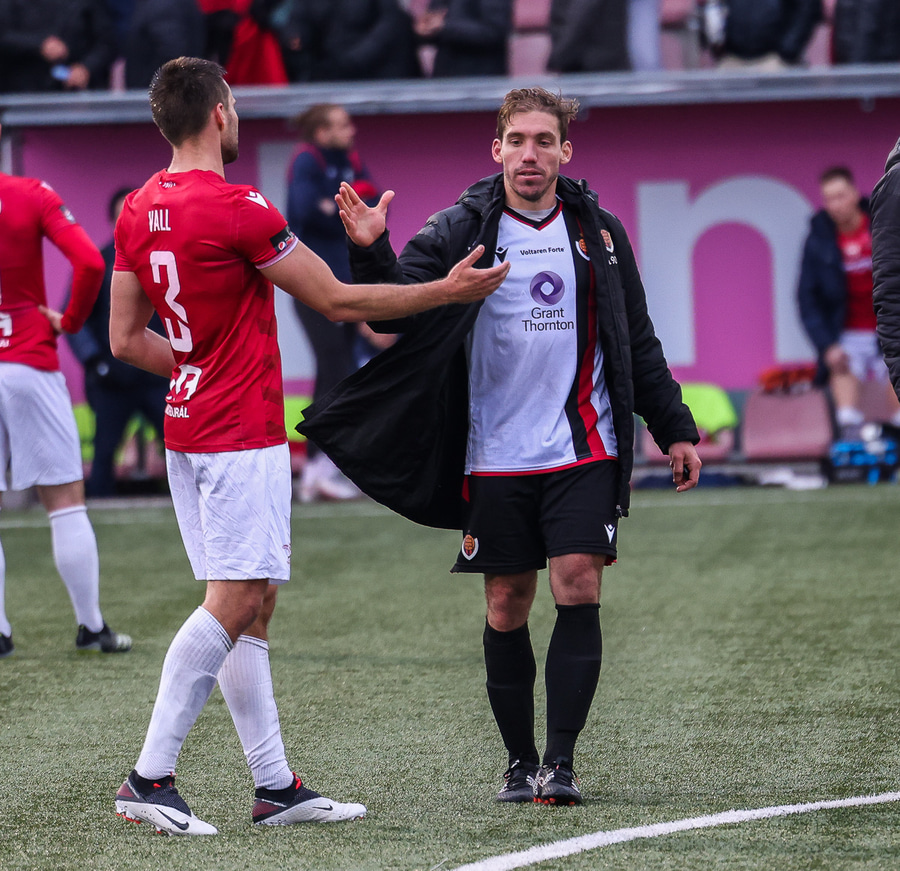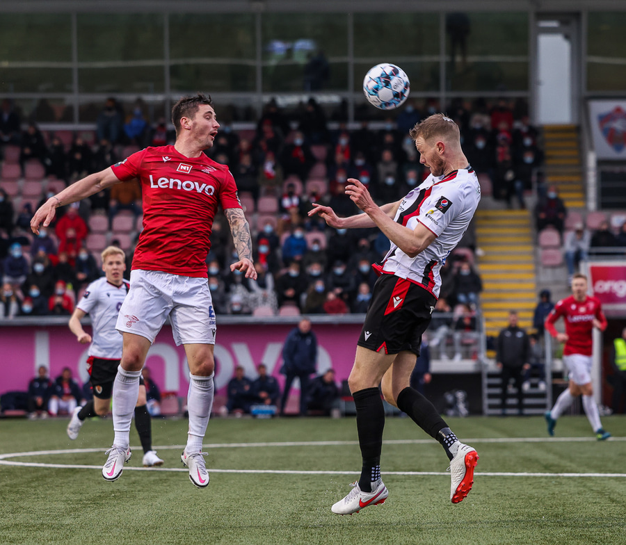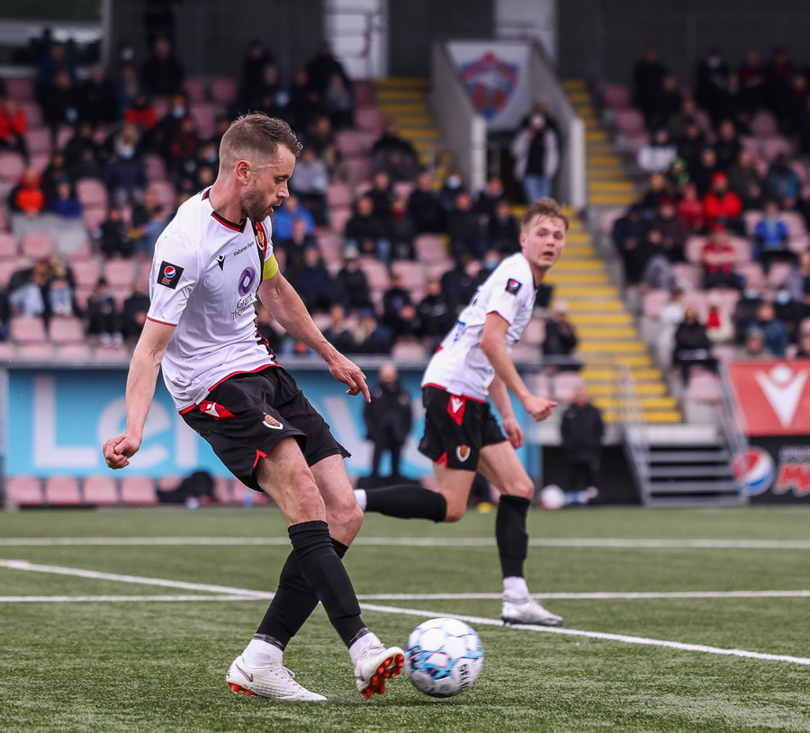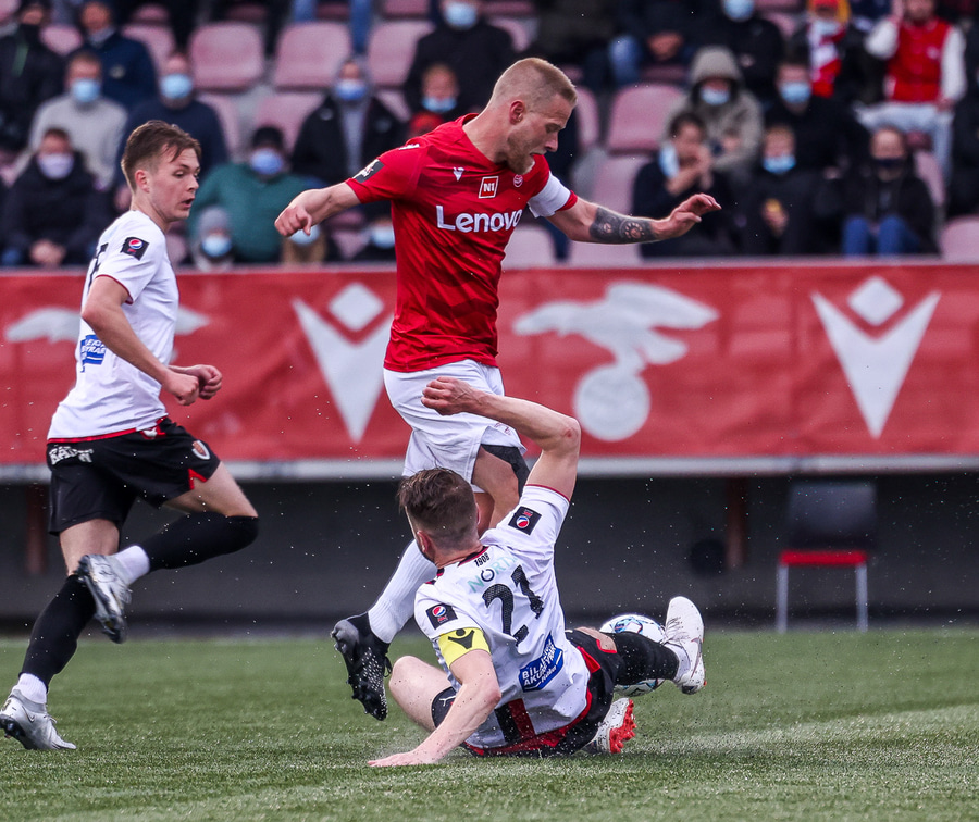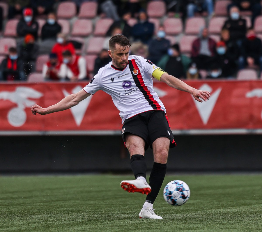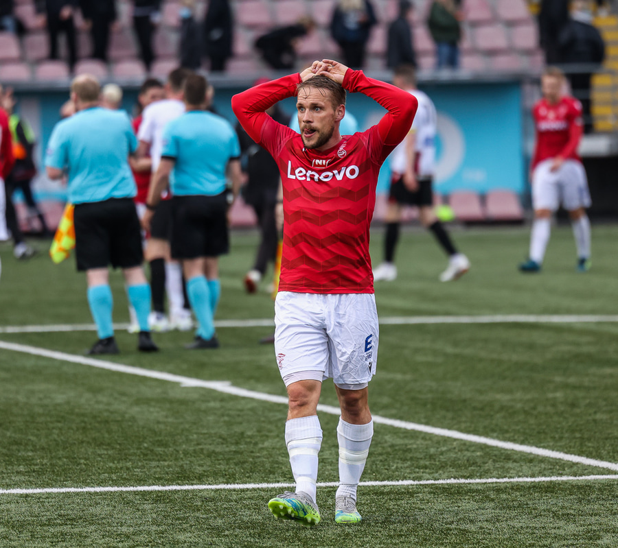 Rasmus lyftir boltanum inn fyrir á Sigga Lár og Þórður kemur á ferðinni og ætlar að koma boltanum í burtu en mistekst það og Siggi Lár kemst í boltann en Þórður Ingason klippir hann niður.