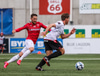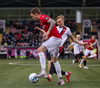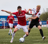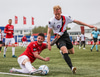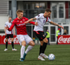 Viktor Örlygur með sturlaðan sprett í átt að teig Vals og kemur boltanum út til hægri á Loga Tómasson sem reynir utanfótar snuddu en Valsmenn koma sér fyrir boltann.