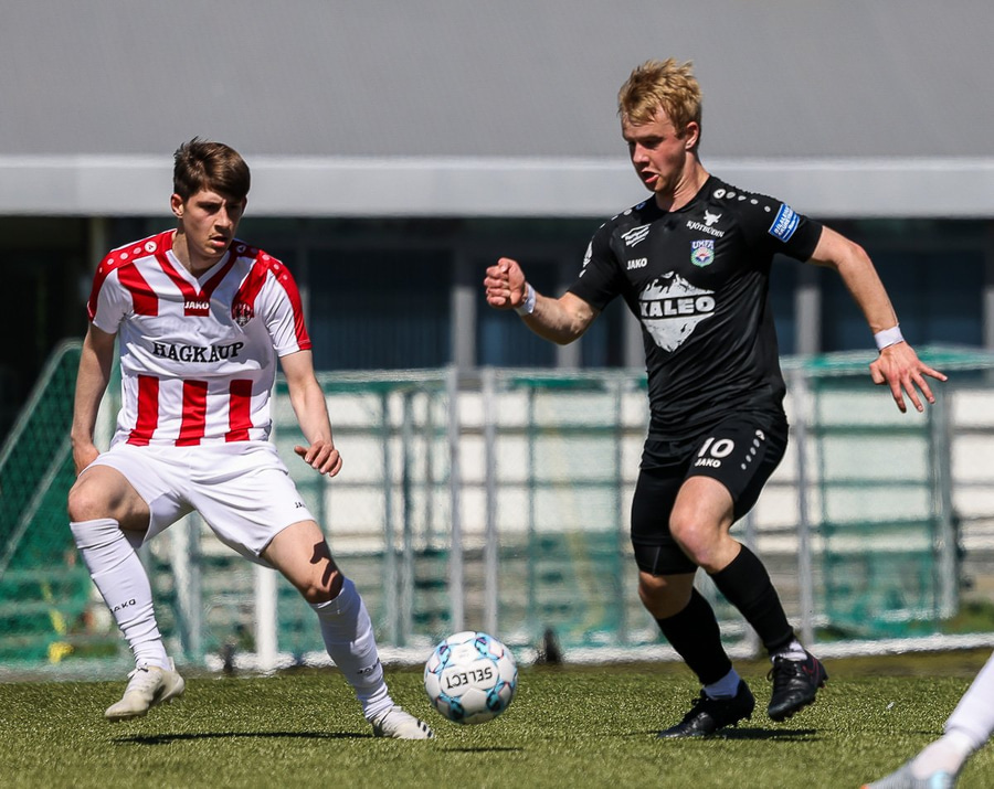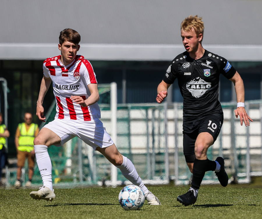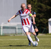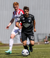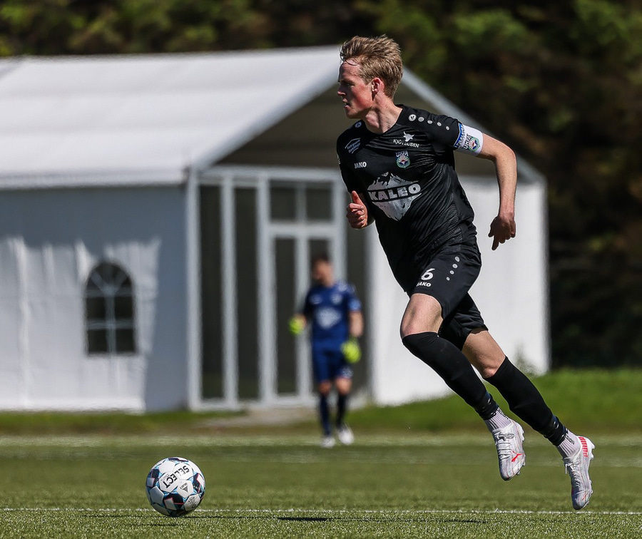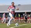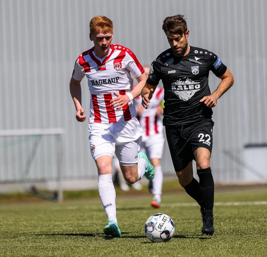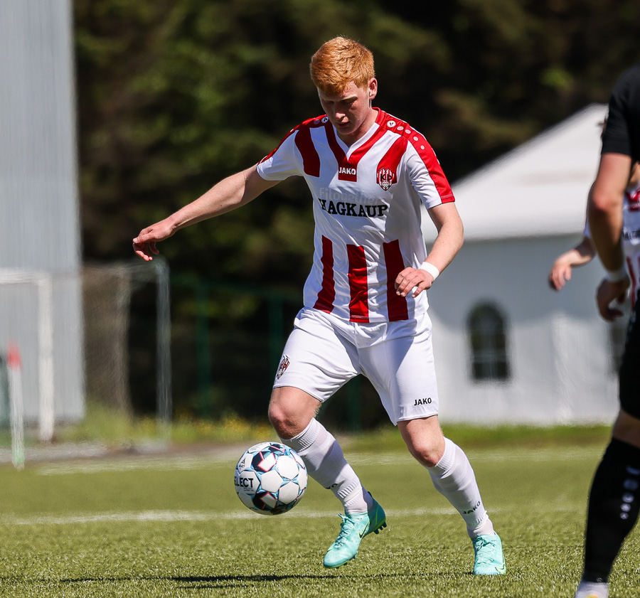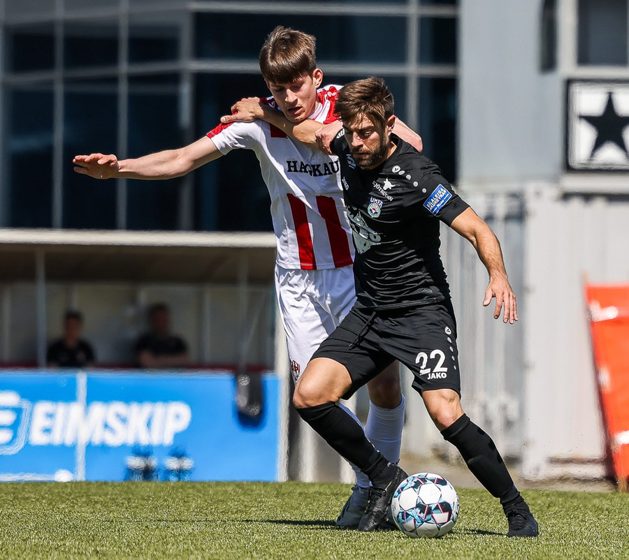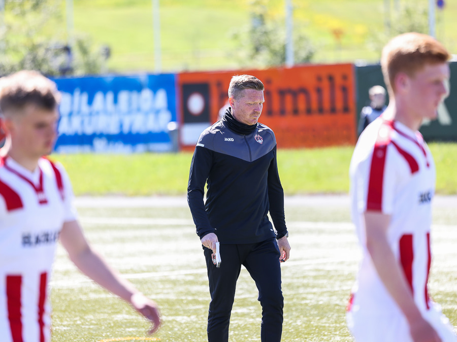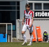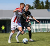 Kraftur í Kára Stein! brunar upp völlinn hægra megin, endar á skoti frá Valgeiri sem Franko ver