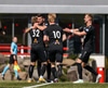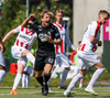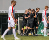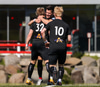 Liðin ganga inn á völlinn. Þróttarar í sínu hefðbundu rauð/hvítu búningum. Afturelding í svörtum varabúningum sínum.