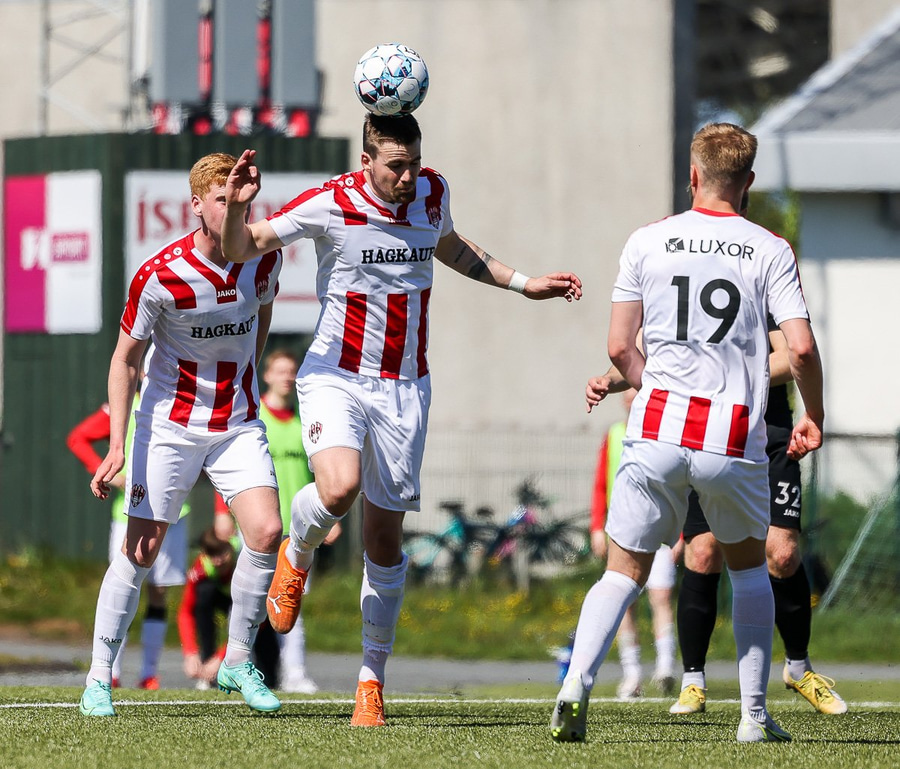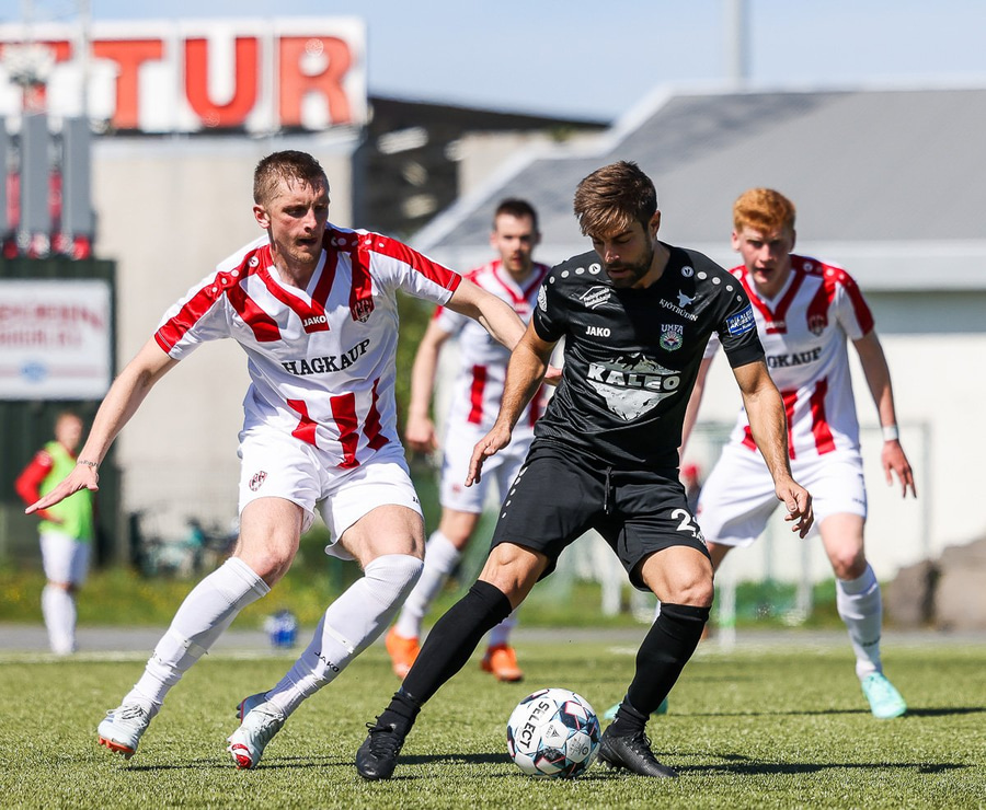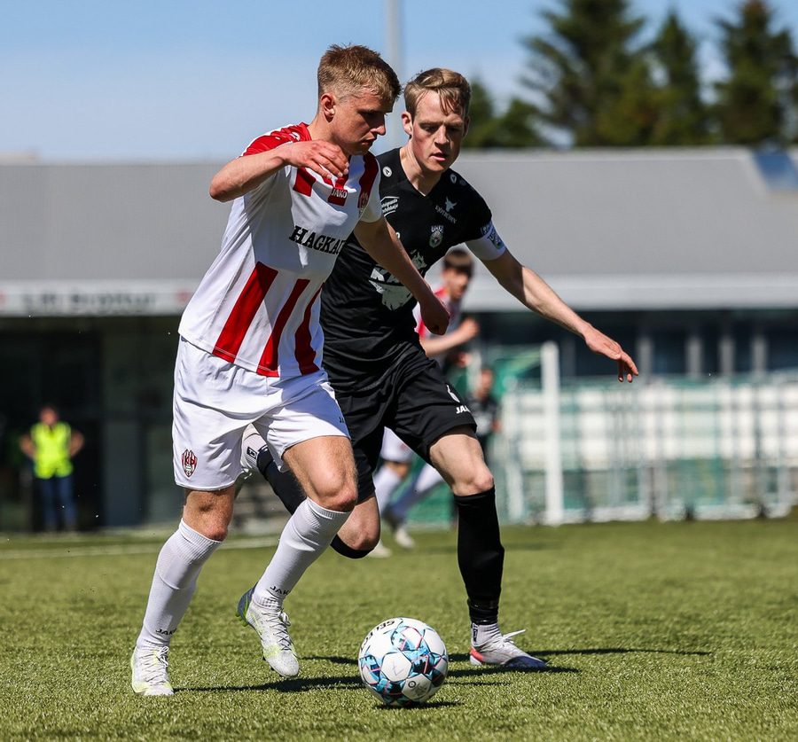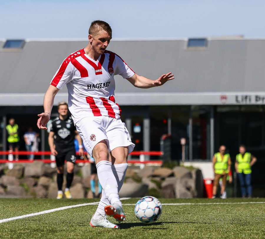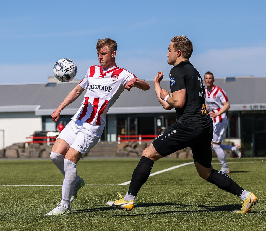 Valgeir kemst upp að endamörkum en Guðmundur kemur boltanum í horn sem gestirnir eiga frá hægri. Ekkert verður úr horninu