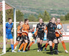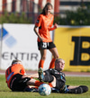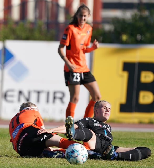 Hörku samstuð milli Snædísar og Bryndísar. Bæði lið nýttu smá vatnspásu í hitanum. Þær stóðu báðar fljótt upp og halda leik áfram.