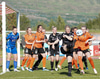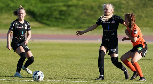 Hulda Karen með fyrirgjöf sem Tinna misreiknar en sem betur fer fyrir hana rúllar boltinn rétt framhjá markinu.