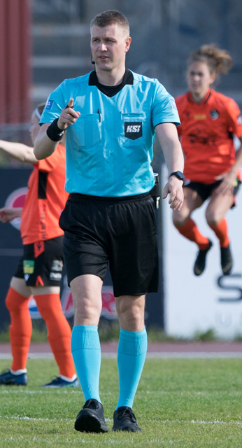 Ekkert varð úr hornspyrnunni. Sara tók markspyrnu stutt á Huldu Björg og Hulda sendi til baka og fær mikla pressu á sig en nær að koma boltanum fra.