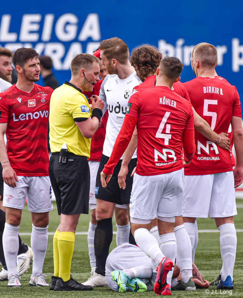 Egill Arnar dómari að missa tökin hér. Bæði lið eru ósátt og Ívar Orri fjórði dómari er í yfirvinnu við að taka við kvörtunum við boðvangana.