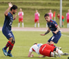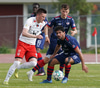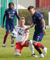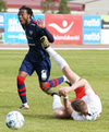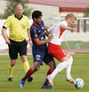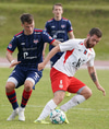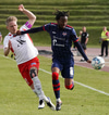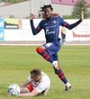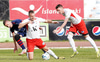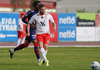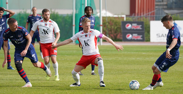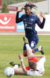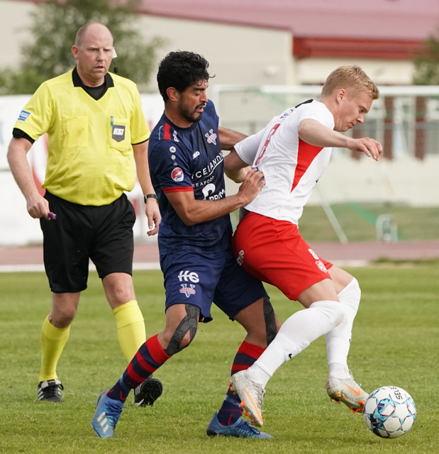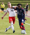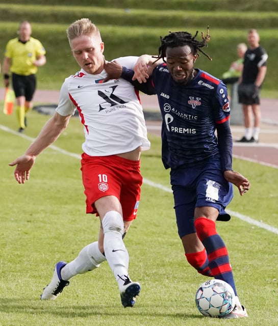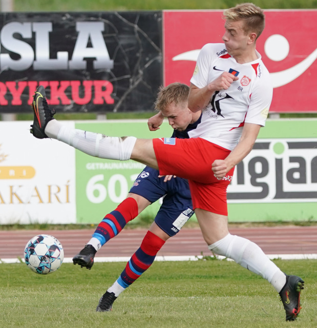 Kundai Benyu var að sleppa einn í gegn en Birgir komst fyrir og Benyu hélt að hann væri að fá horn en dæmdur brotlegur.