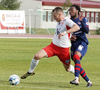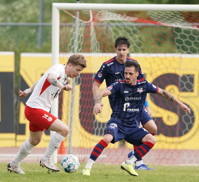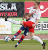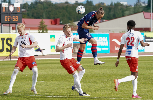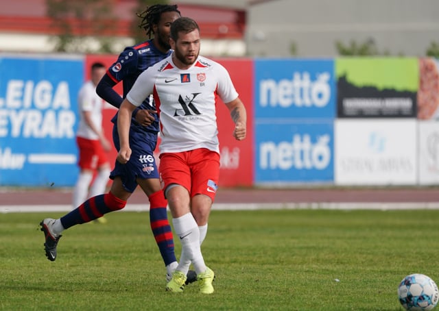 Jóhann Helgi reynir að troða sér í gegnum vörn Vestra en missir boltann síðan of langt frá sér í fangið á Brenton.