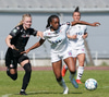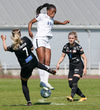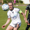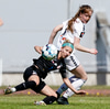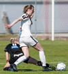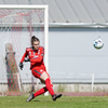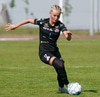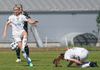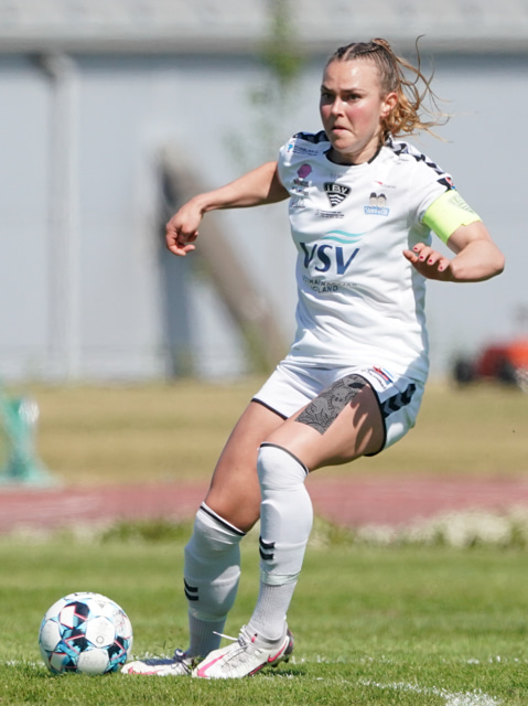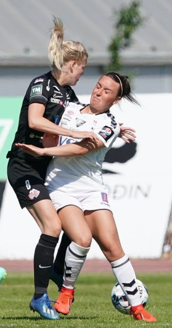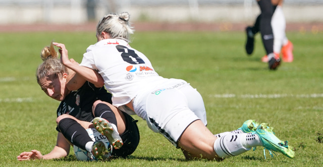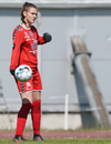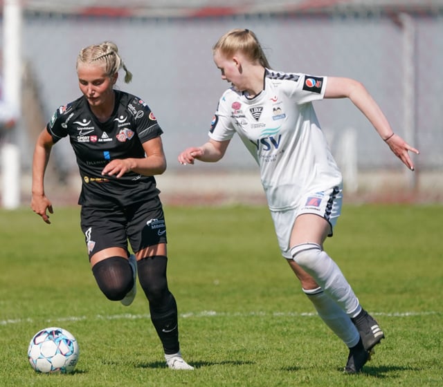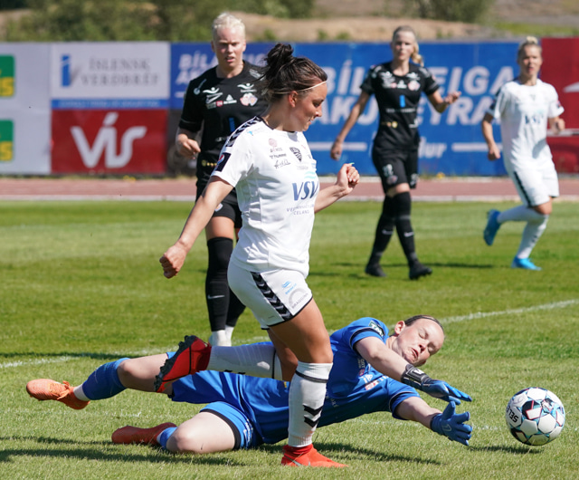Boltinn dettur fyrir Olgu, hún þarf að teygja sig í boltann og skóflar honum vel yfir.
