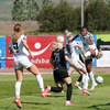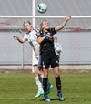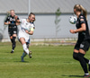 Fyrirgjöf sem er skallað frá, Snædís Ósk lúrir fyrir utan teiginn og á skot sem fer framhjá markinu.