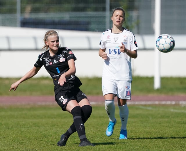 Góð hugmynd hjá Viktorjiu, hún reyndi stungusendingu en aðeins og fast og innarlega, Harpa nær boltanum.
