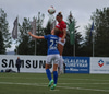 Mist stekkur hæst og nær föstum skalla en hann fer yfir markið.