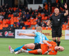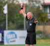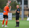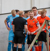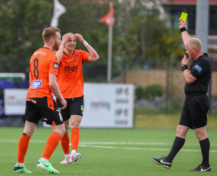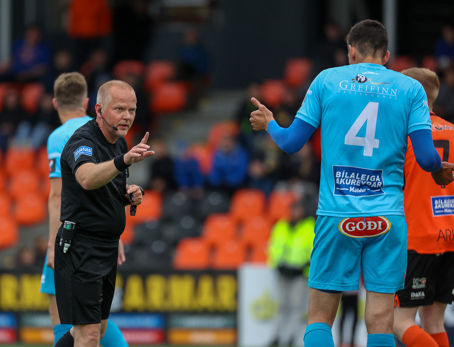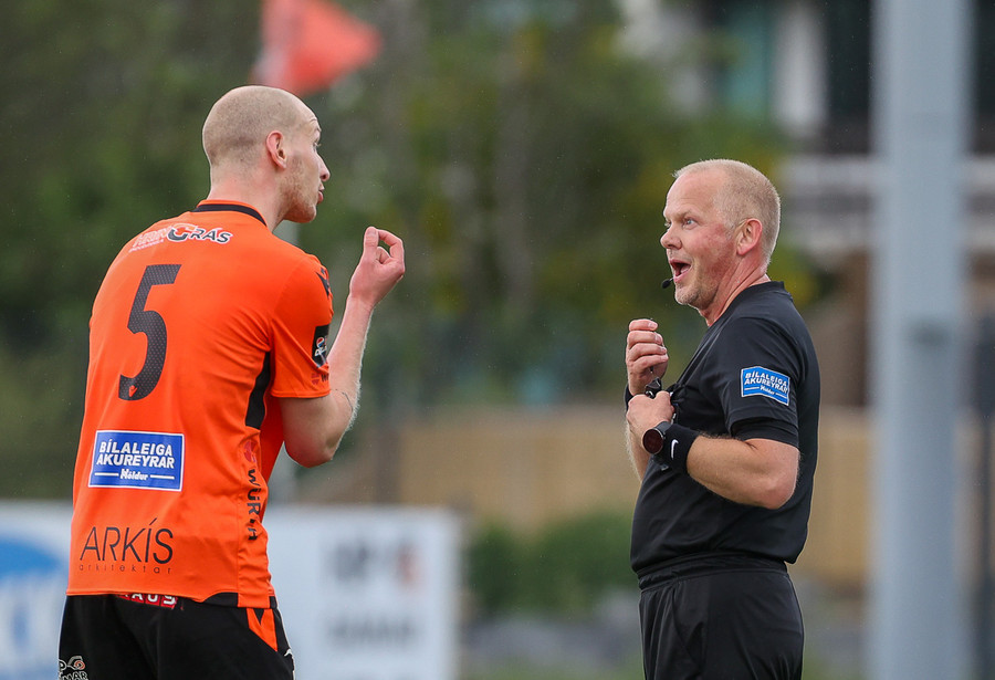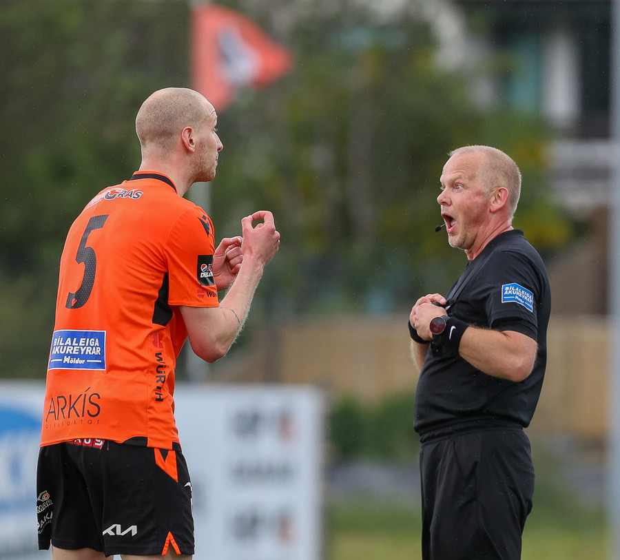 Lætur í sér heyra eftir baráttu í teignum. Vildi meina að brotið hafi verið á sér. Erlendur Eiríksson spjaldar hann fyrir mótmælin.