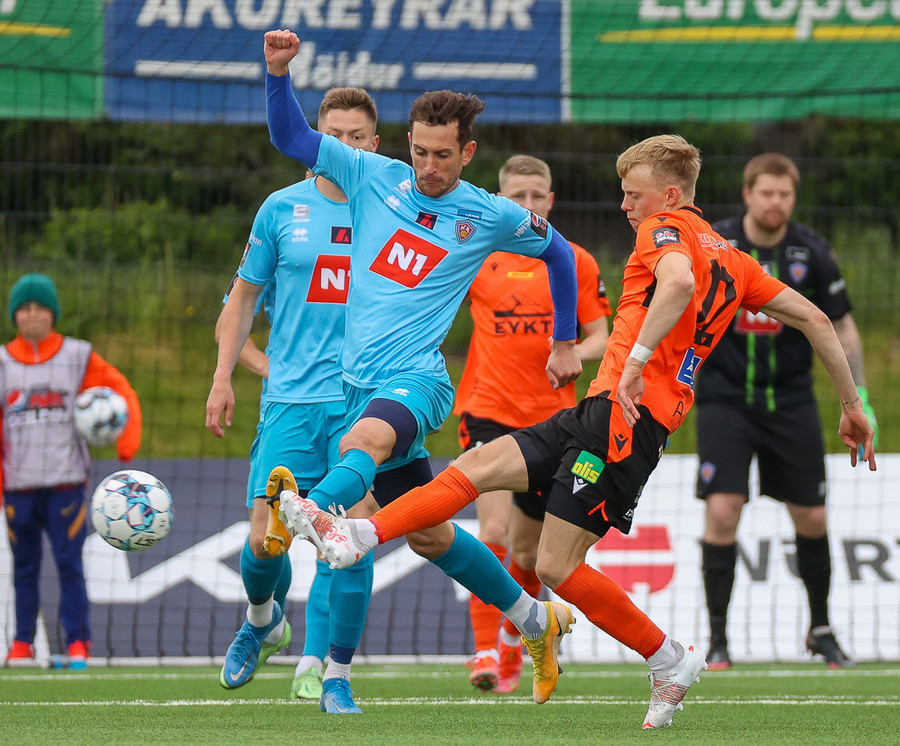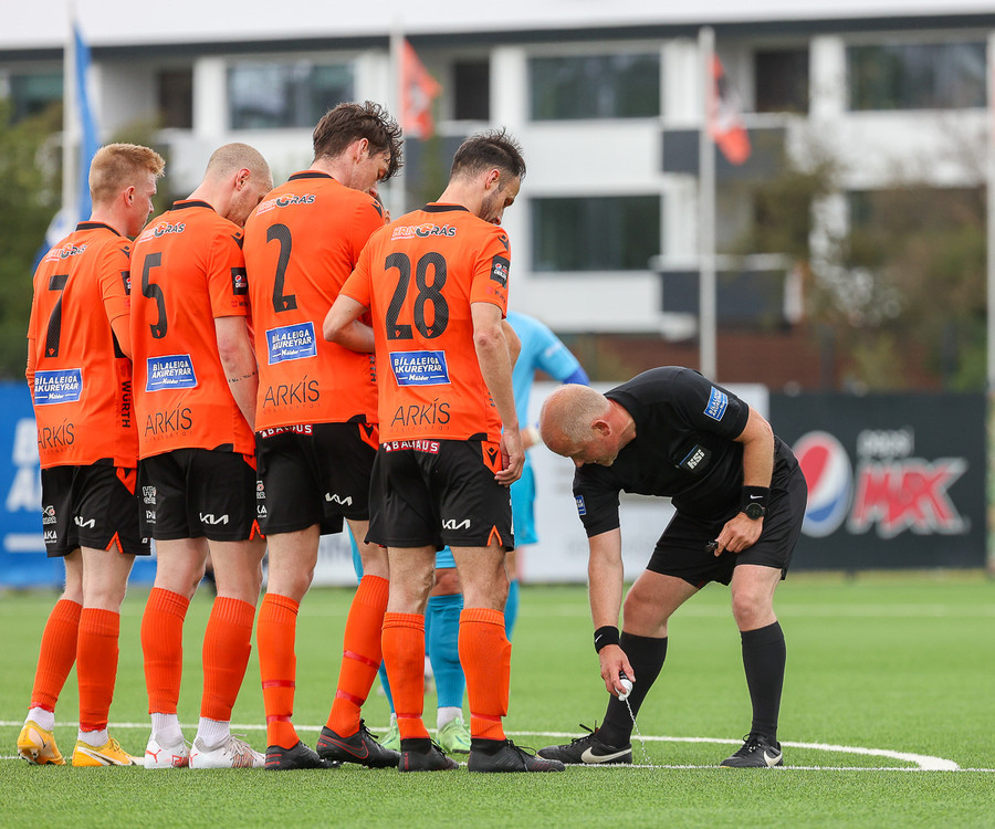 Hallgrímur Mar með aukaspyrnu og mér sýndist boltinn vera að fljúga í hornið en hann fór naumlega framhjá. Góð tilraun hjá Hallgrími.