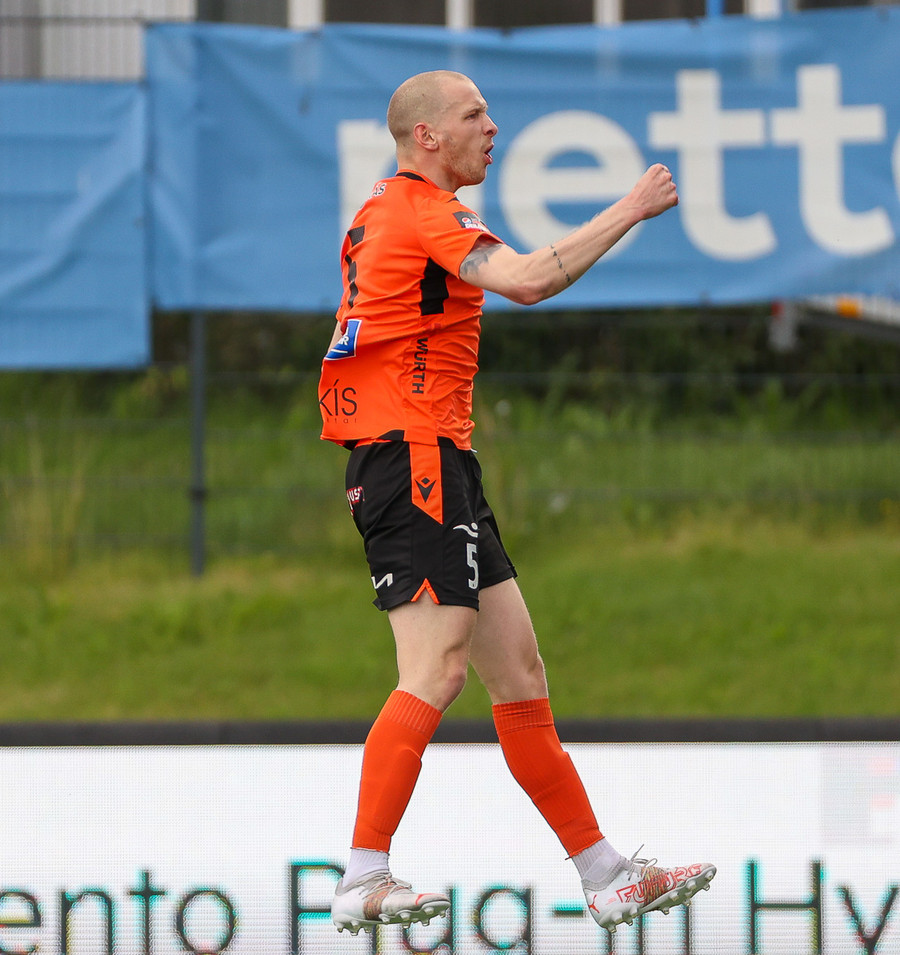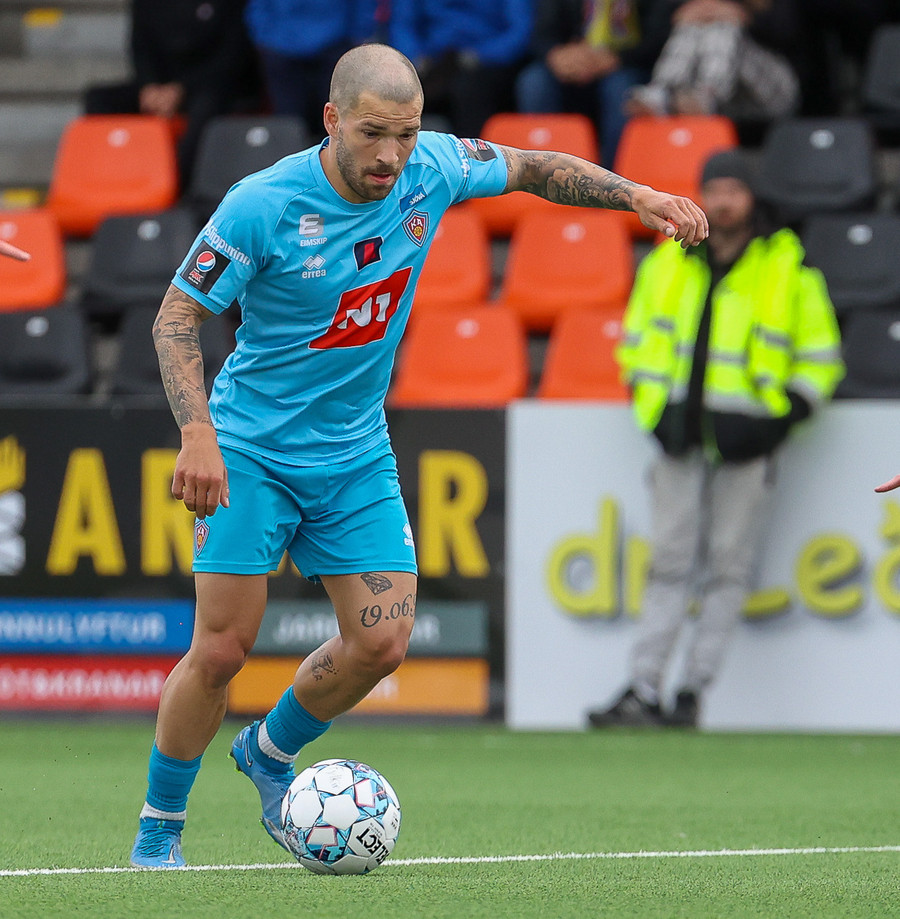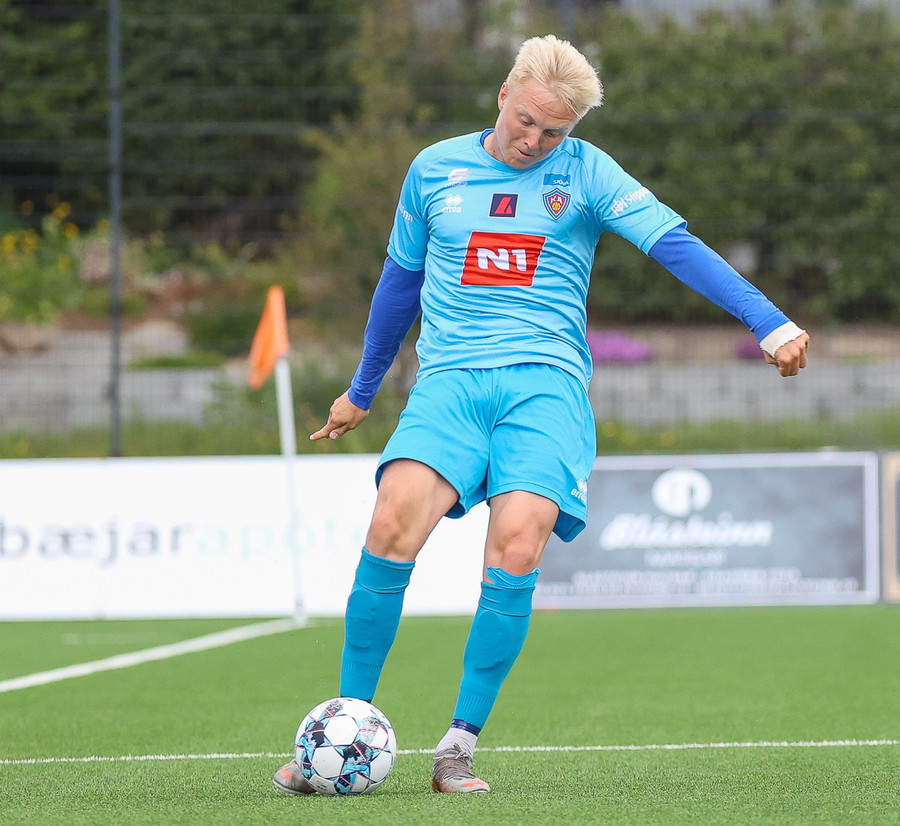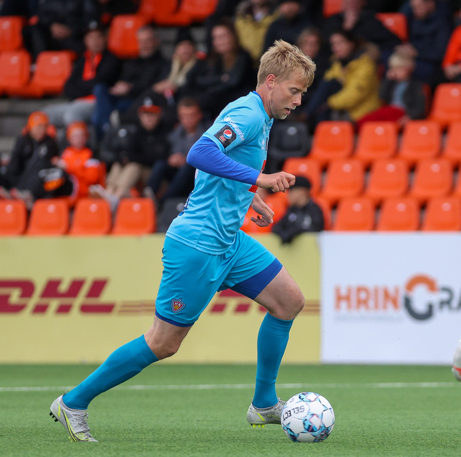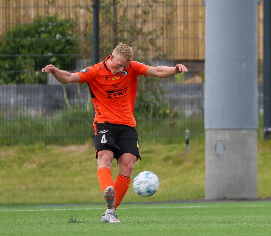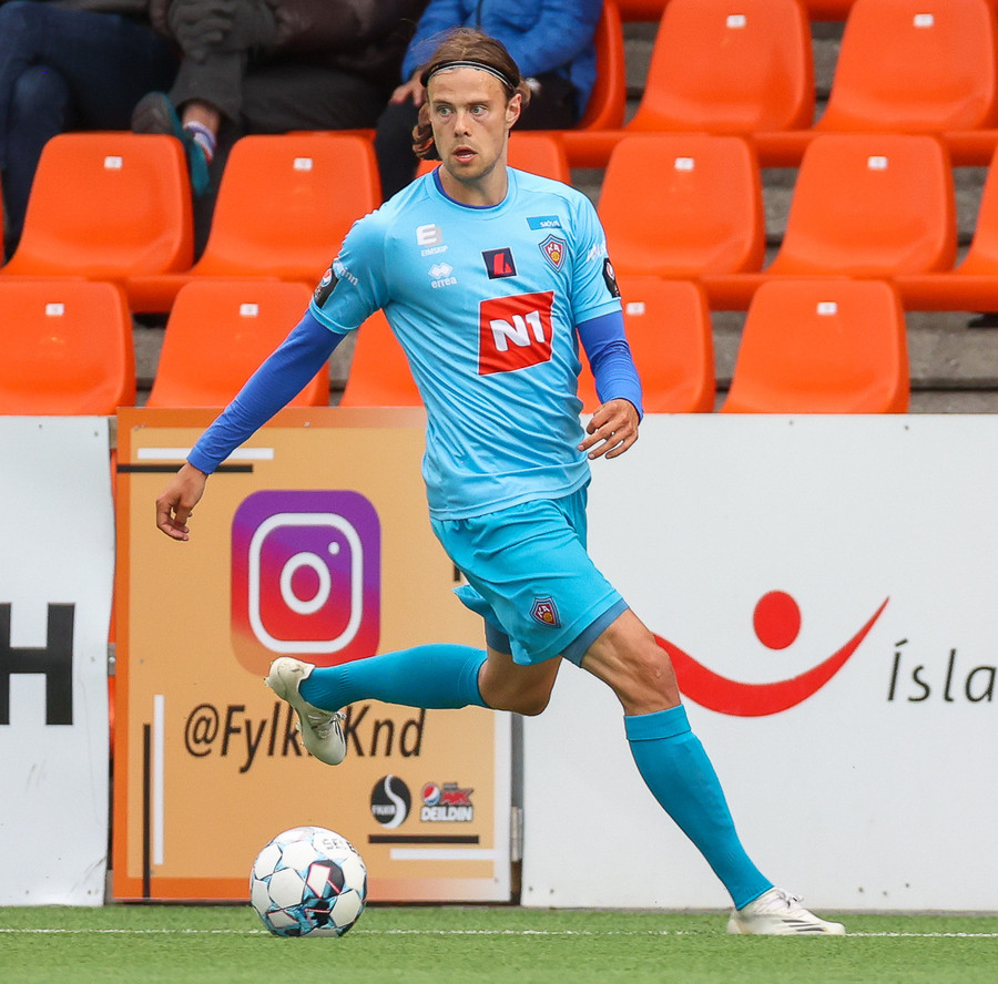 Miðvörðurinn sem brýtur ísinn í þessum leik við mikla kátínu stuðningsmanna Fylkis.