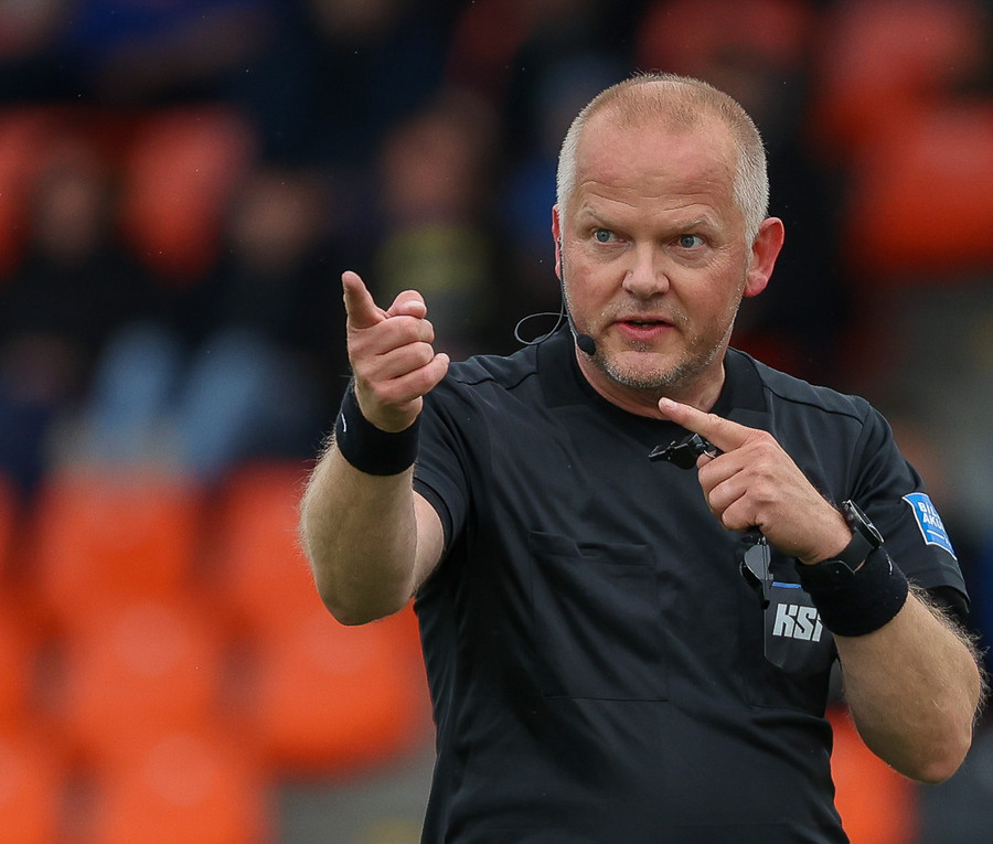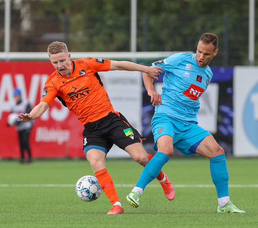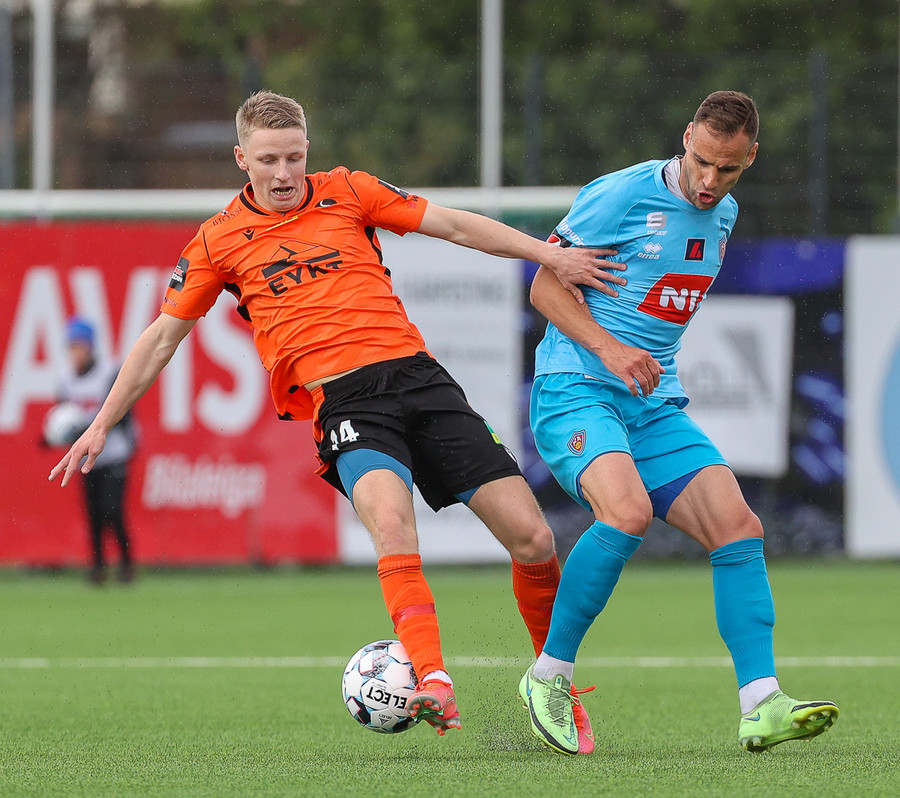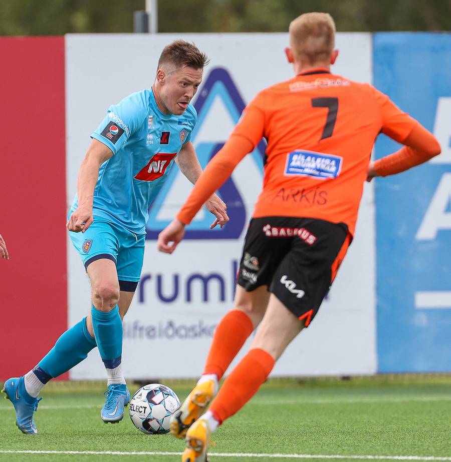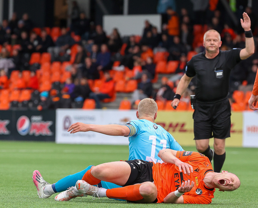 Orri Sveinn Stefánsson dæmdur brotlegur í baráttu við Elfar Árna Aðalsteinsson. Fóru báðir upp í boltann en Orri var of seinn. Hárréttur dómur.