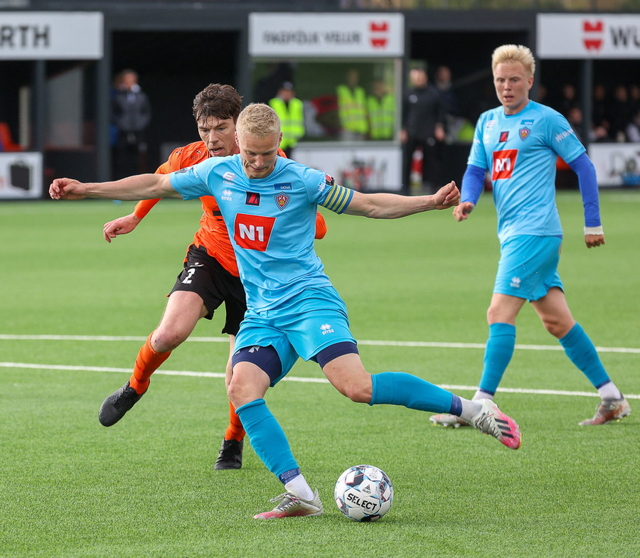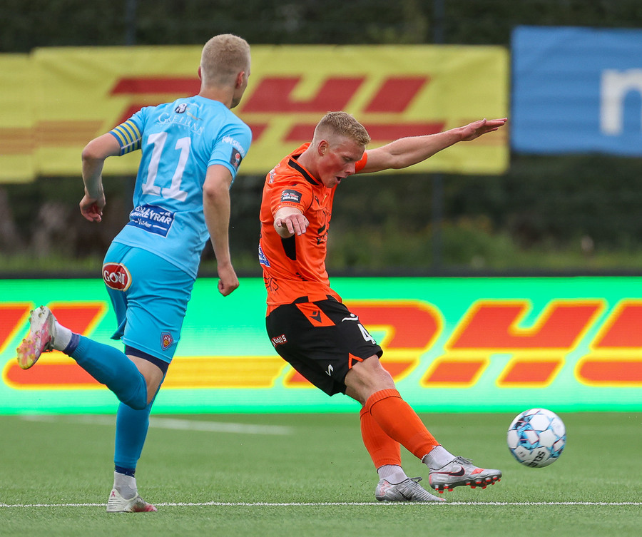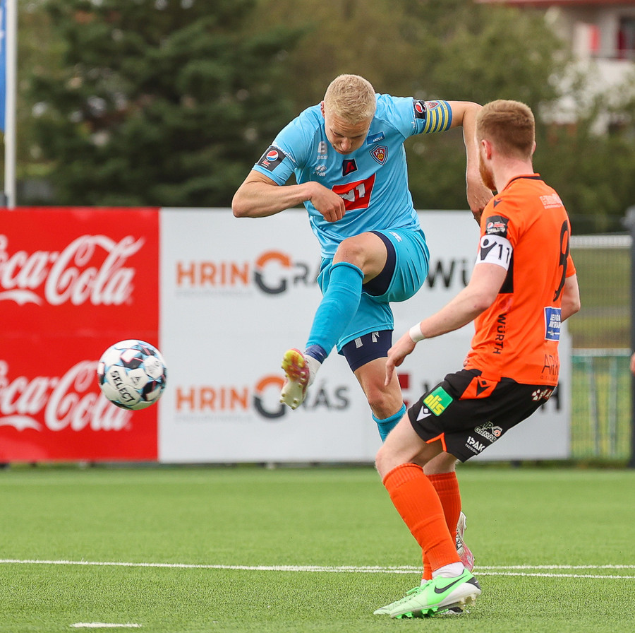 Þórður Gunnar að ógna, tekur skot í varnarmann. Orri Hrafn var við hlið hans og vildi fá boltann en Þórður lét sjálfur vaða.