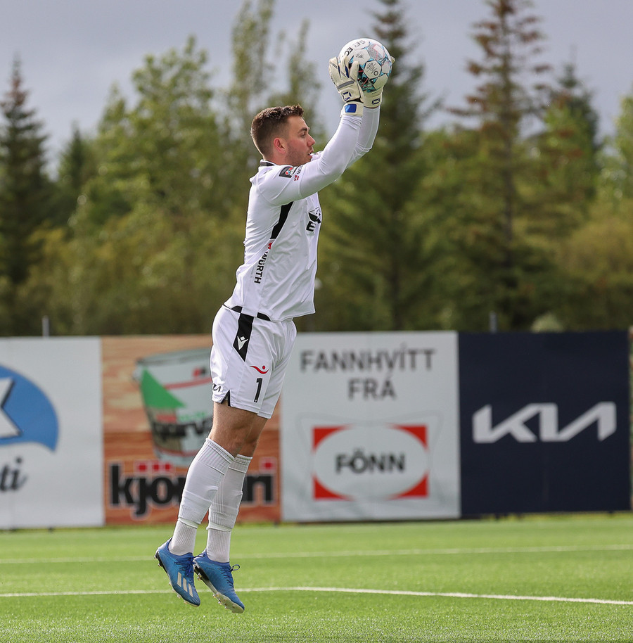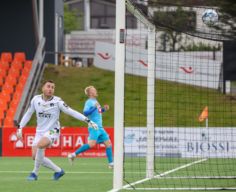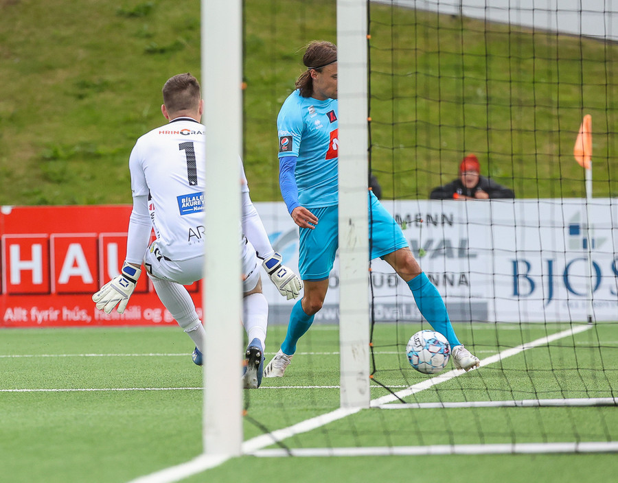 Nökkvi á síðan skot sem Aron ver... Steinþór Freyr tekur frákastið og SKORAR... en flaggið komið á loft. Steinþór var rangstæður.