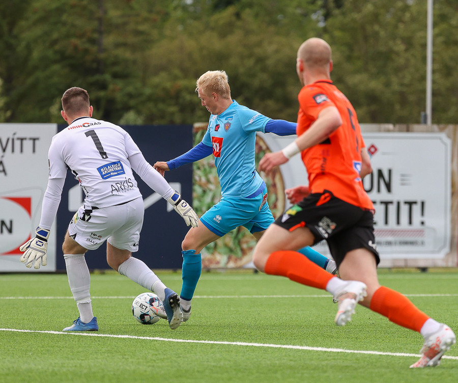 Barátta í teignum en þetta endar allt með því að Aron Snær hirðir boltann.