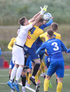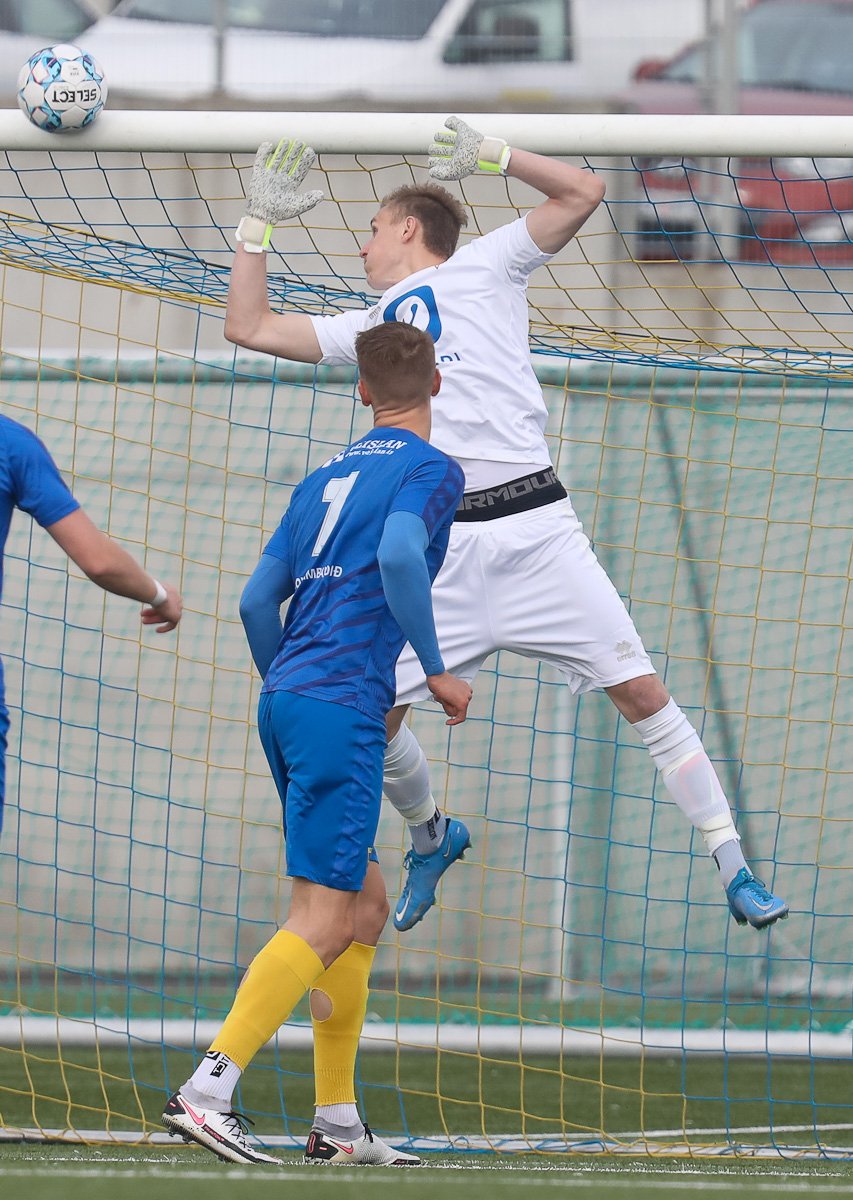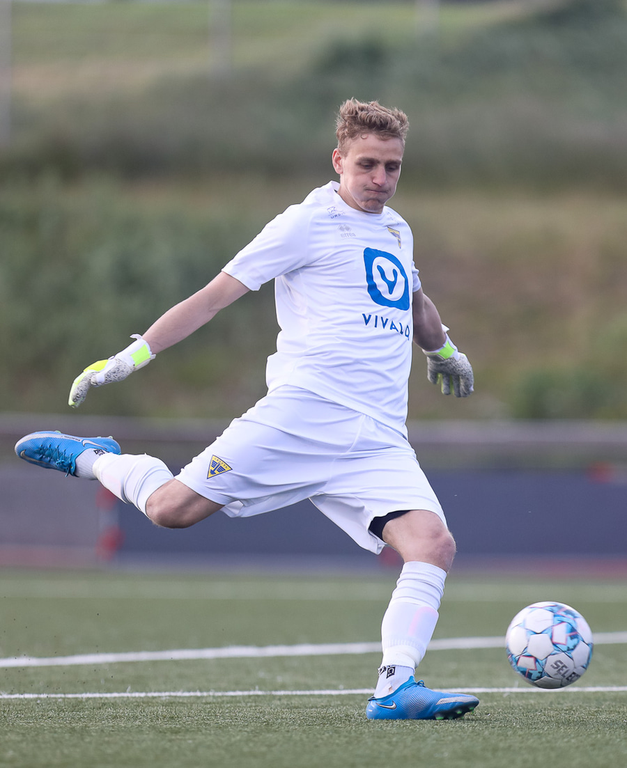 Spyrnan beint á Jón Ívan sem missir hann en nær svo að grípa hann eftir á. Heppinn þarna.