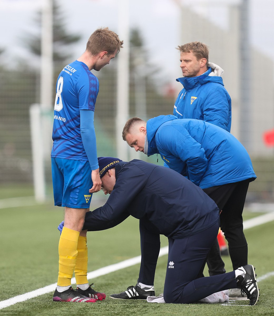 Bakare fær eitthvað högg á fótinn og haltrar aðeins. Vonandi fyrir Fjölni helst hann heill en hann er allavega ekki að biðja um neina skiptingu.