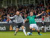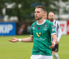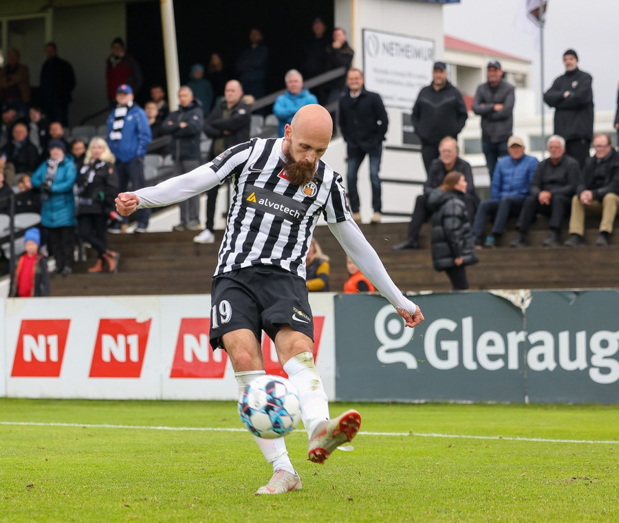 Langur bolti fram og þar er Mikkelsen mættur, nær skoti úr þröngu færi sem Grétar kassar í horn.
