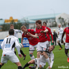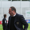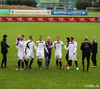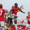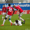 Menn eru að reyna að fóta sig á blautum vellinum. Erfiðlega gengur að koma boltanum milli manna. Þetta fer rólega af stað.