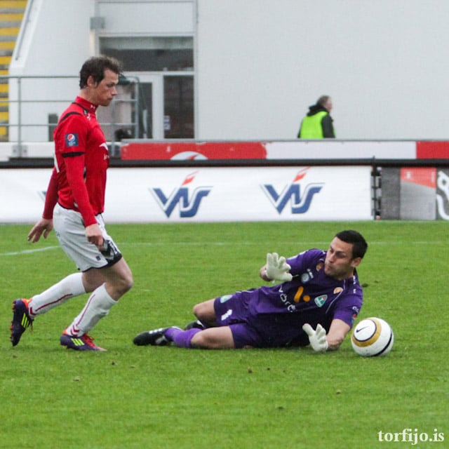 Olgeir Sigurgeirsson náði að koma boltanum í netið en var dæmdur rangstæður. Ómögulegt að dæma um það héðan. Olgeir var allavega mjög ósáttur.