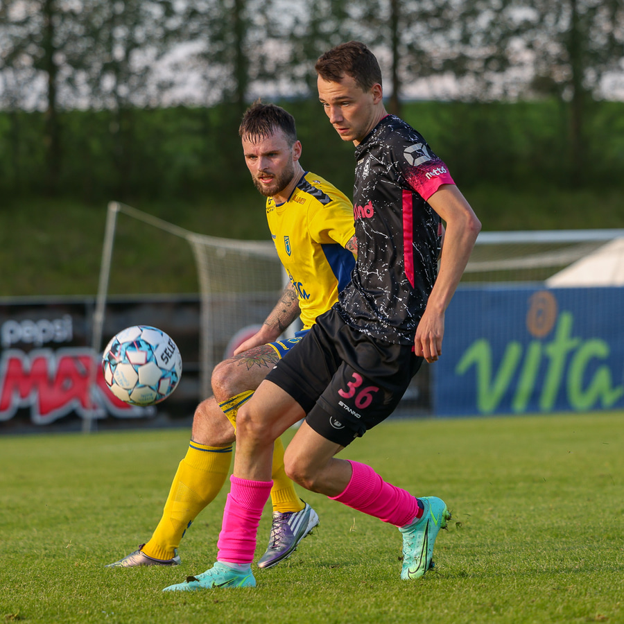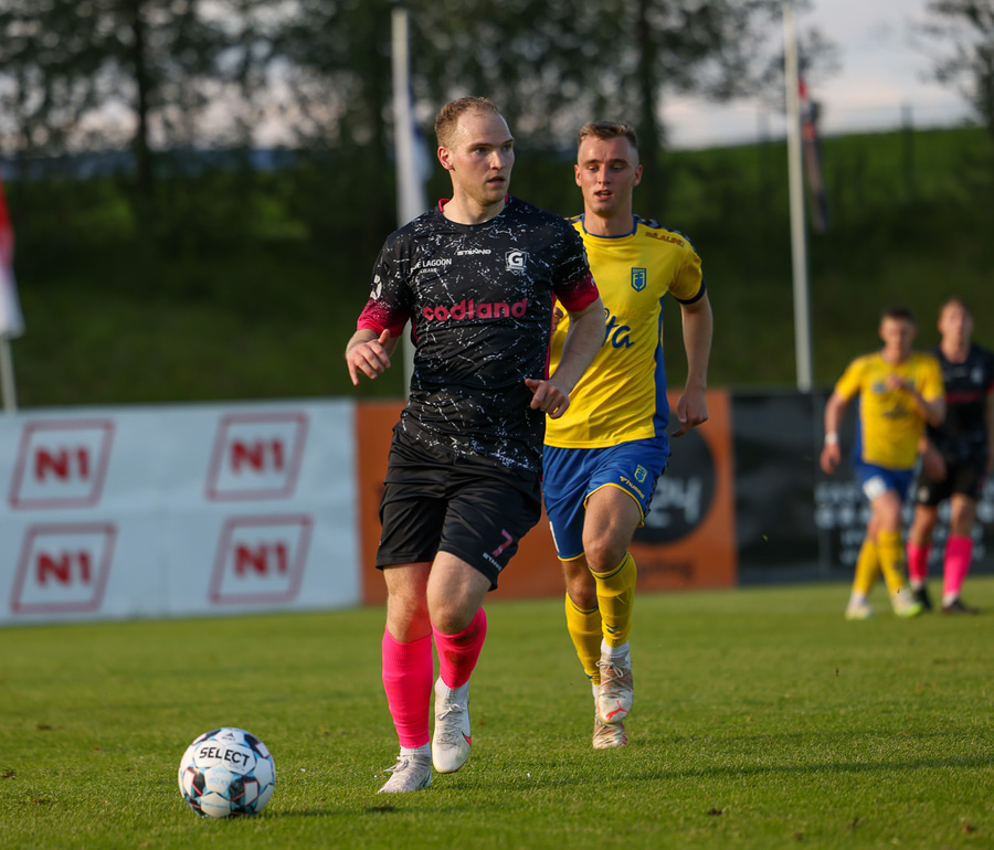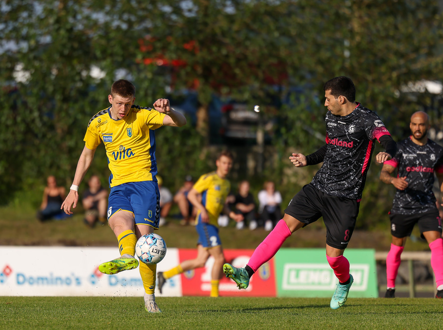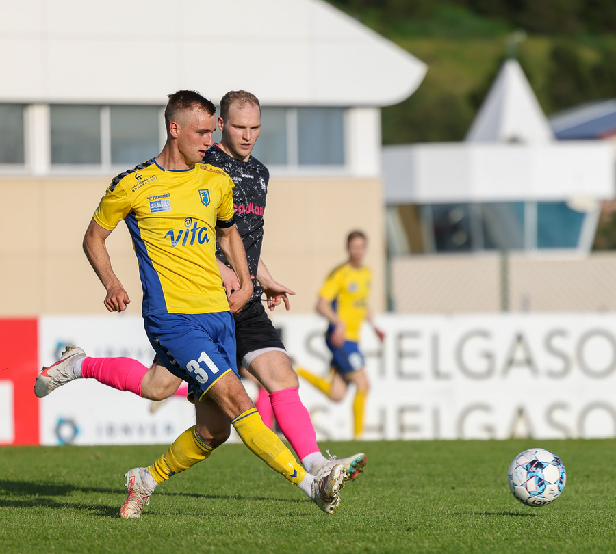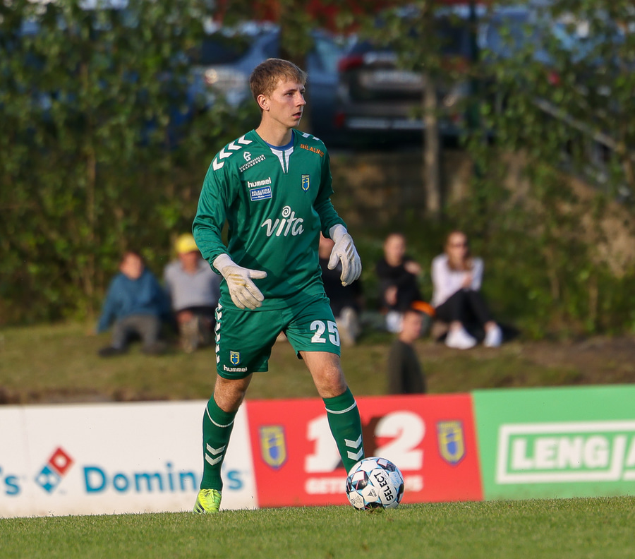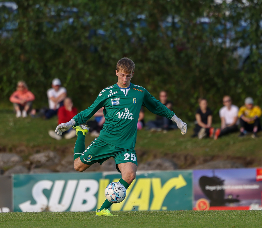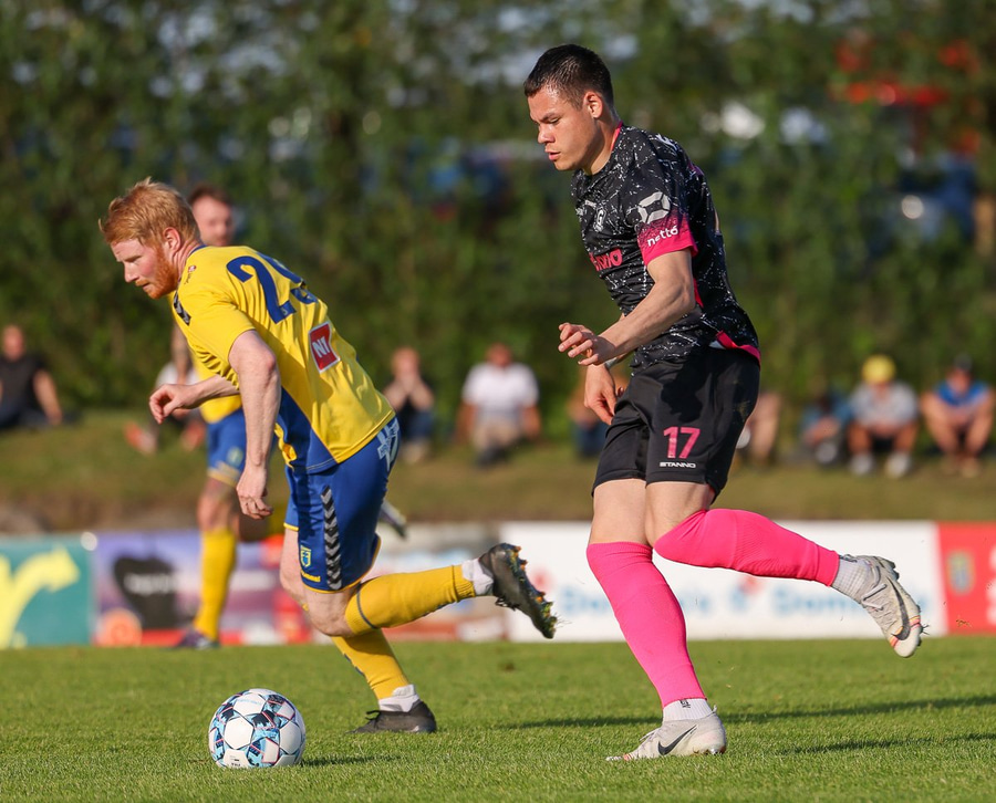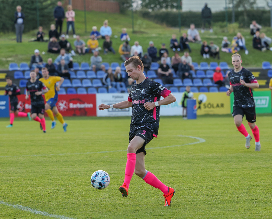 Andri Freyr losar boltann út á hægri kantinn á Viktor sem reynir lágann bolta fyrir en hann kemst ekki á samherja.