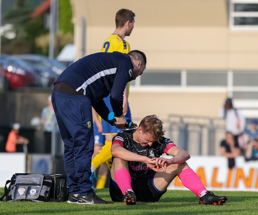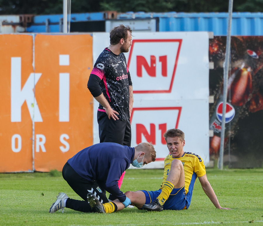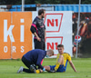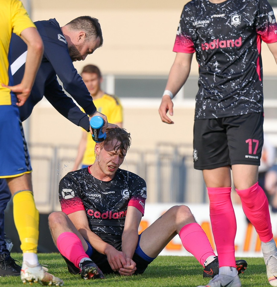 Ekkert að ganga upp hjá Grindvíkingum eins og stendur. Aron Dagur liggur núna eftir og þarf aðhlynningu.