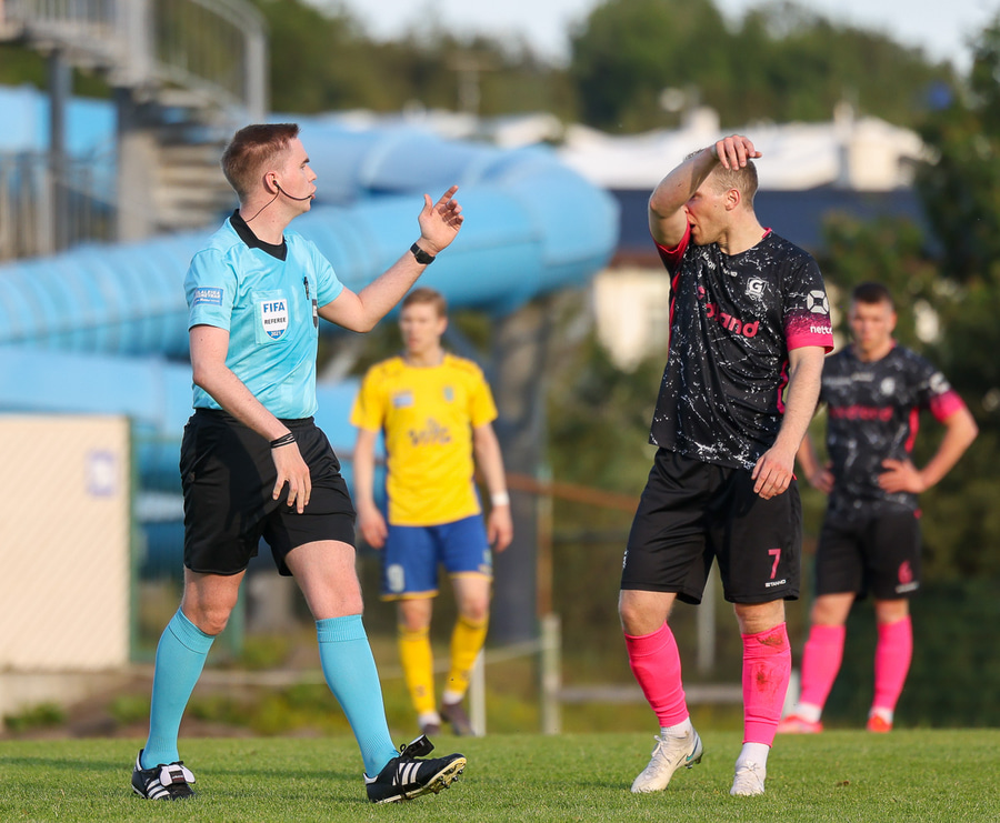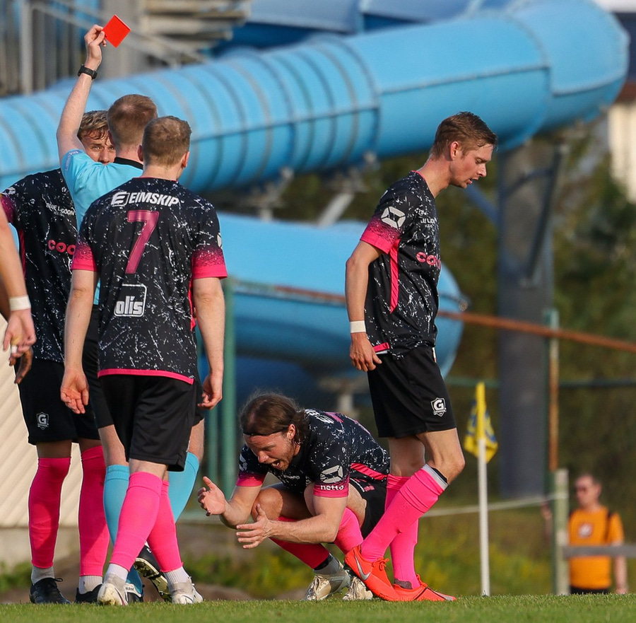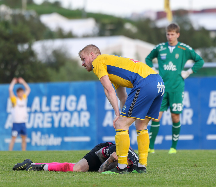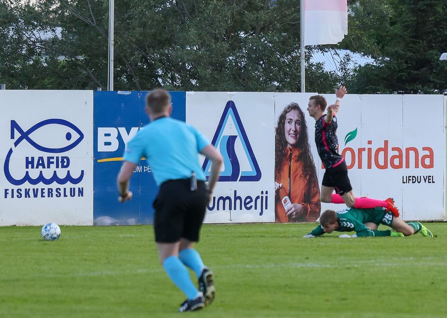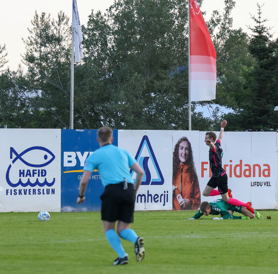 Sigurður Bjartur fær langan bolta fram og gerir frábærlega til að koma boltanum framhjá Alexanderi en hann hleypur svo á hann og Bjössi Hreiðars er brjálaður, vildi mögulega fá að sjá það rauða.