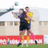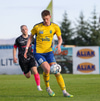 Jóhann Árni með gott skot fyrir utan teig en vel varið hjá Aroni í markinu.